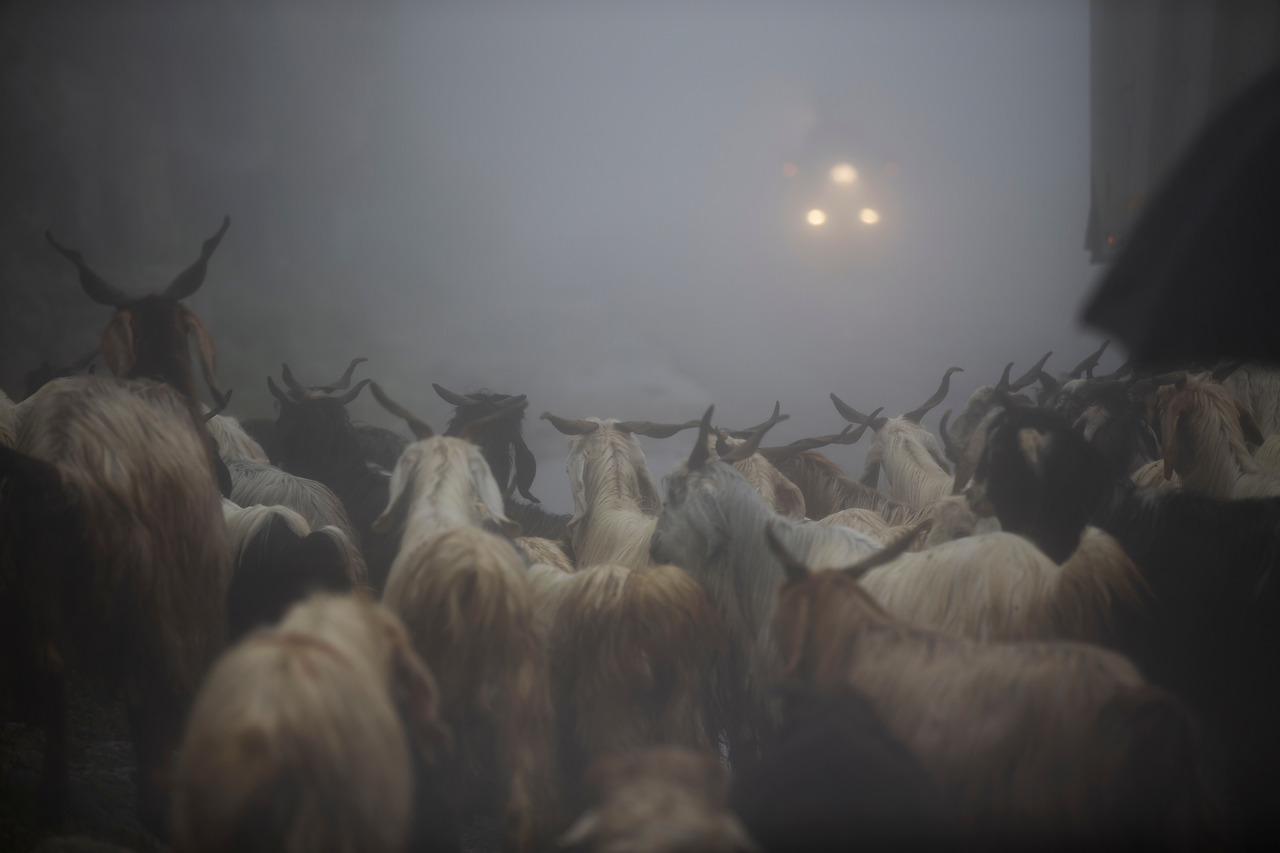 짙은 안갯속으로 한 떼의 염소 무리가 도로를 점유하였다.