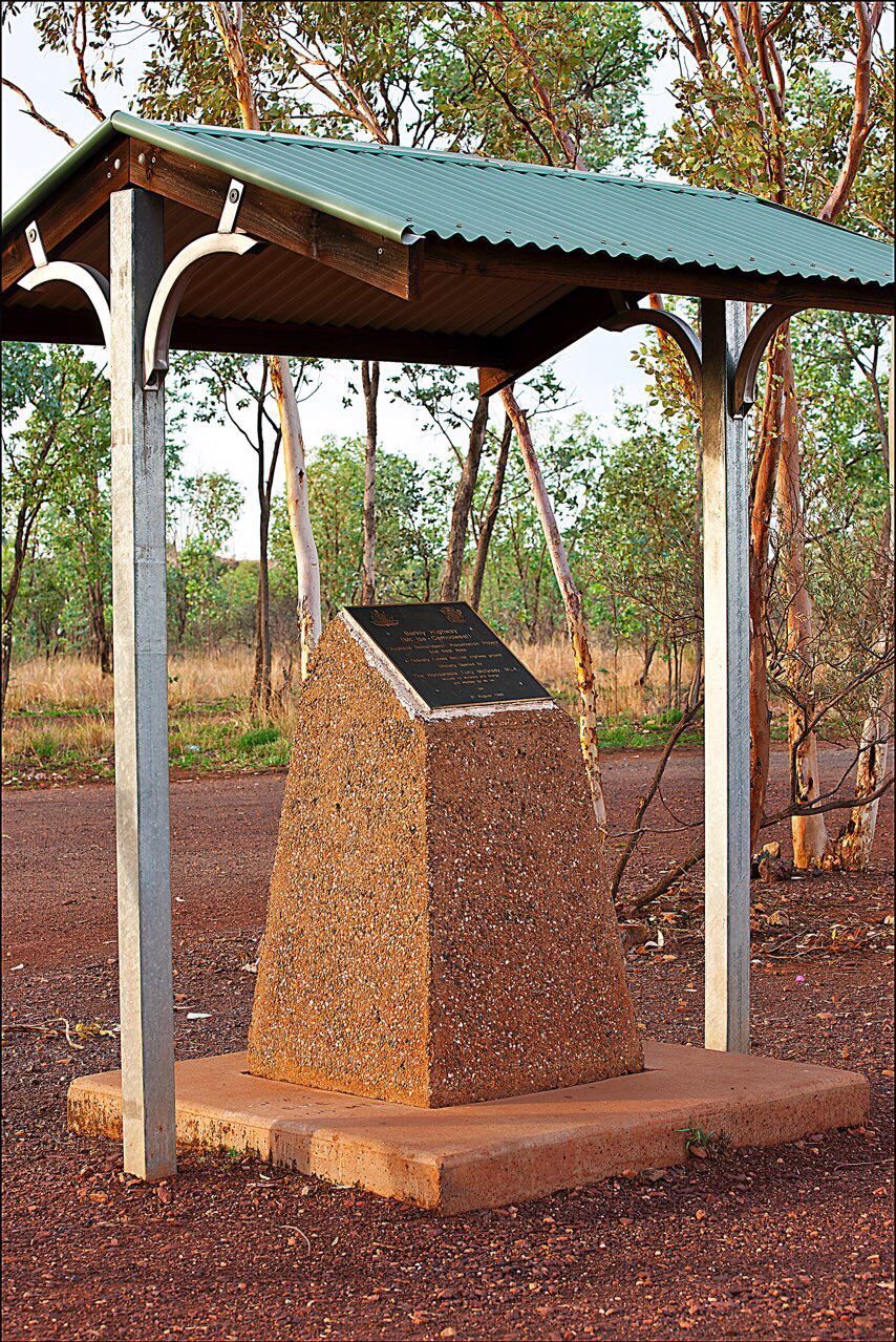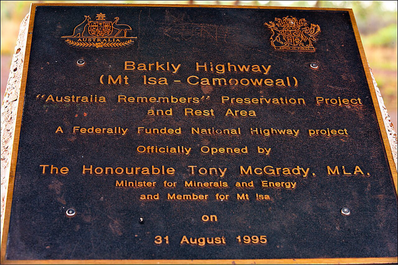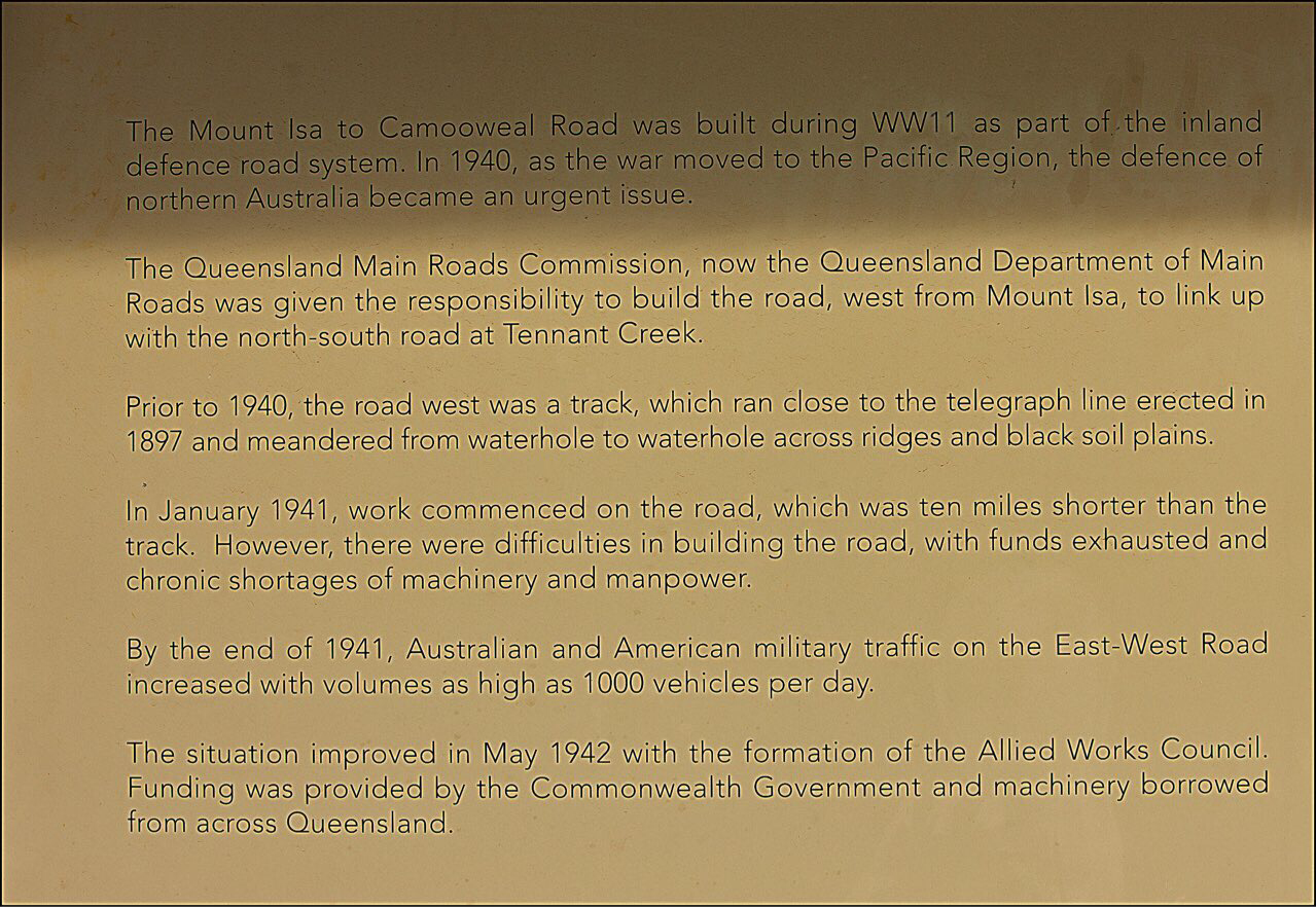 Mount Isa에서 약 50Km를 지나오자 눈에 새롭게 들어오는 한 표지판이 있는데……주의를 끄는 것이 World War II Site라고 쓰여진 표지판있어 그쪽으로 차를 세웠다. 어떻게 이런 오지에 이차 세계대전을 기념하는 장소가 있을 수 있을까? 차를 세우고 내려 가보니 지붕을 세워 기념비를 보호하고 있는데 가까이 가서 보니 Barkly Highway를 기념하는 동판이 박혀 있었다. Mount Isa에서 Camooweal까지 188Km 도로를 완성했다는 기념비였다.
