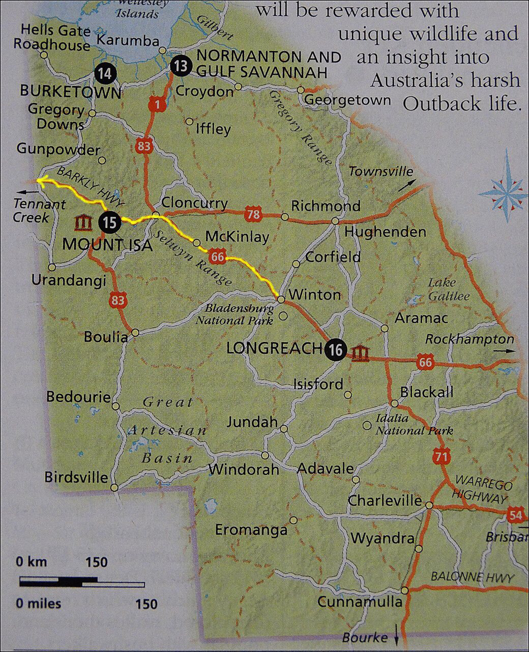 여행서에서 보여주는 Queensland주 Outback지도이다. 울루루 바위를 보려면 15번 숫자가 표시된