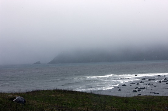 근래에 비가 많이 왔는지 멀리서 보이는 바위산 계곡에 하얀 폭포수가 줄줄 흘러내린다. 음산한 바다 안개가 산 정상을 덮어 버려 산들의 높이를 가늠할 수가 없었다.