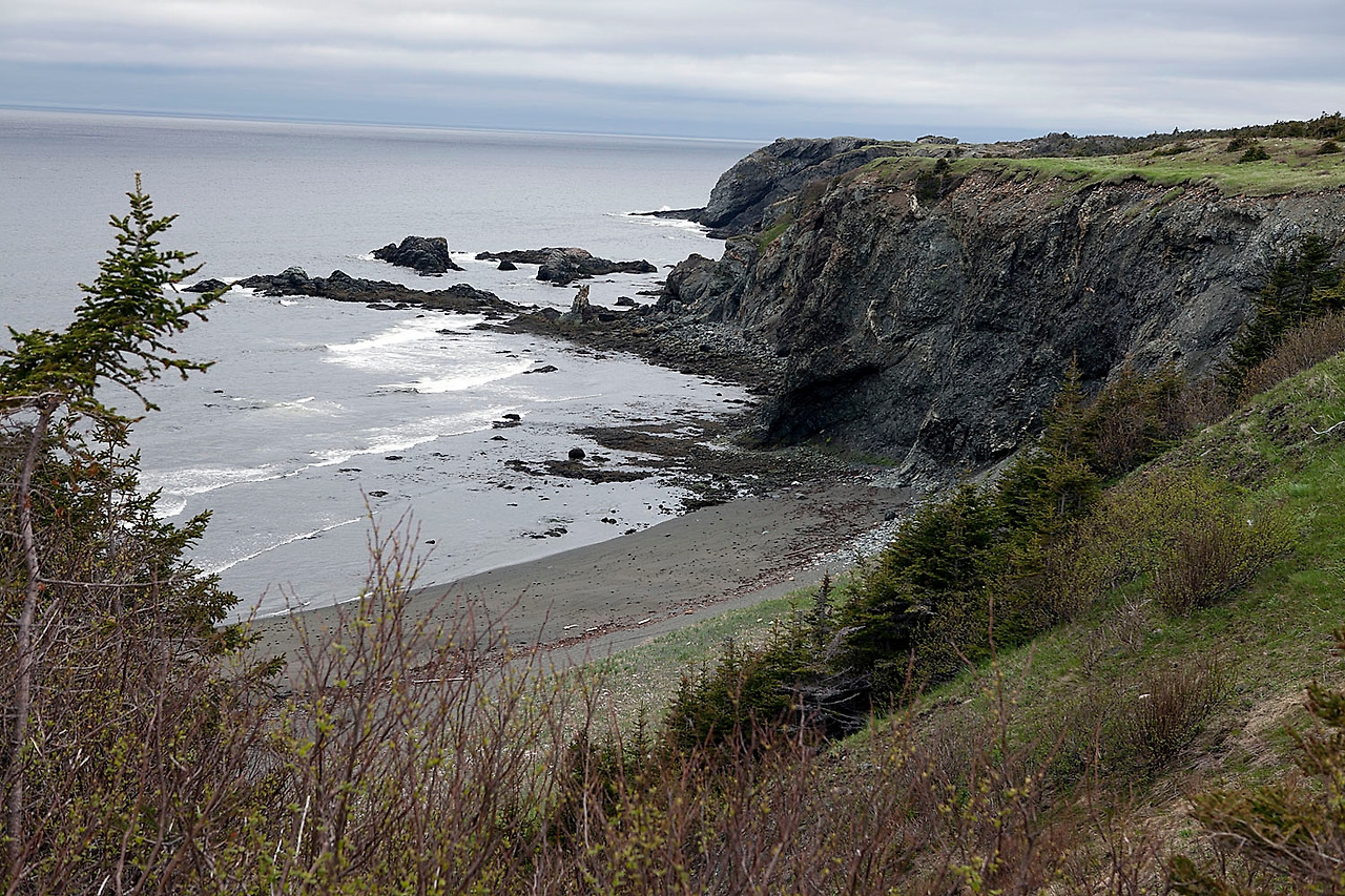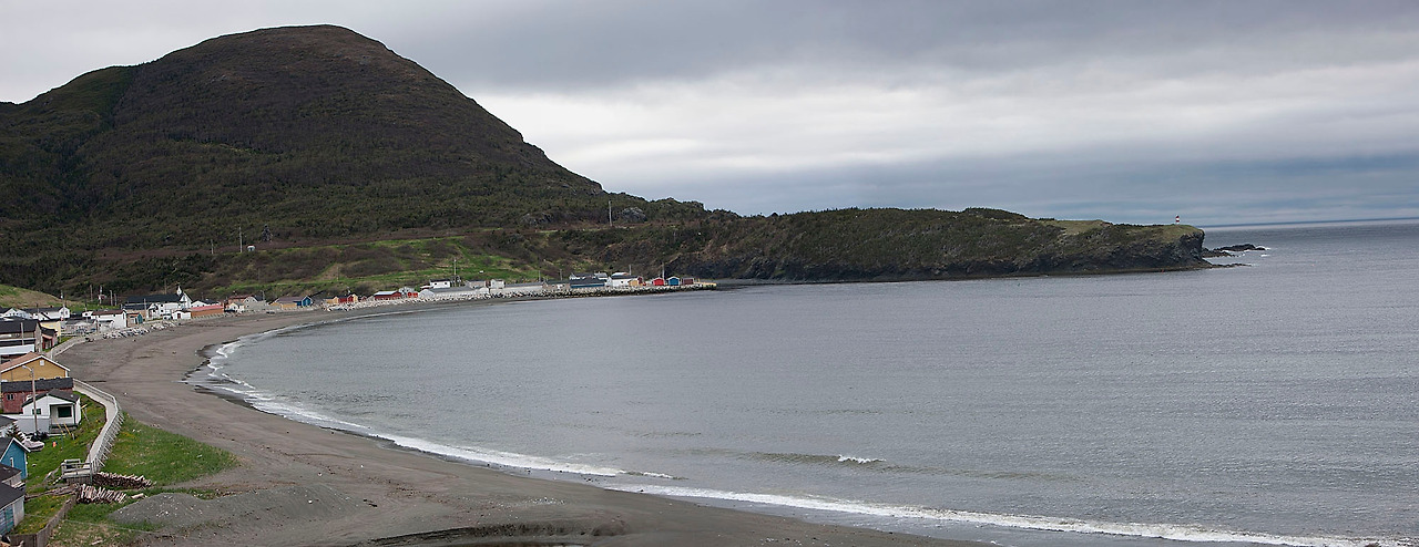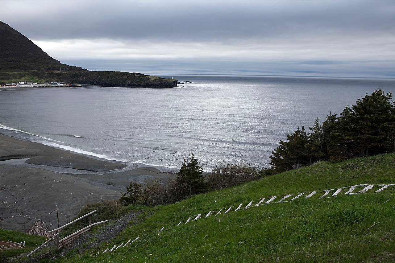마을 옆에 있는 산등성에 올라가서 내려다본 Trout River 바닷가 전경으로 활대처럼 둥글게 휘어진 해안선을 따라 광활한 대서양 바다가 펼쳐져 있었다.