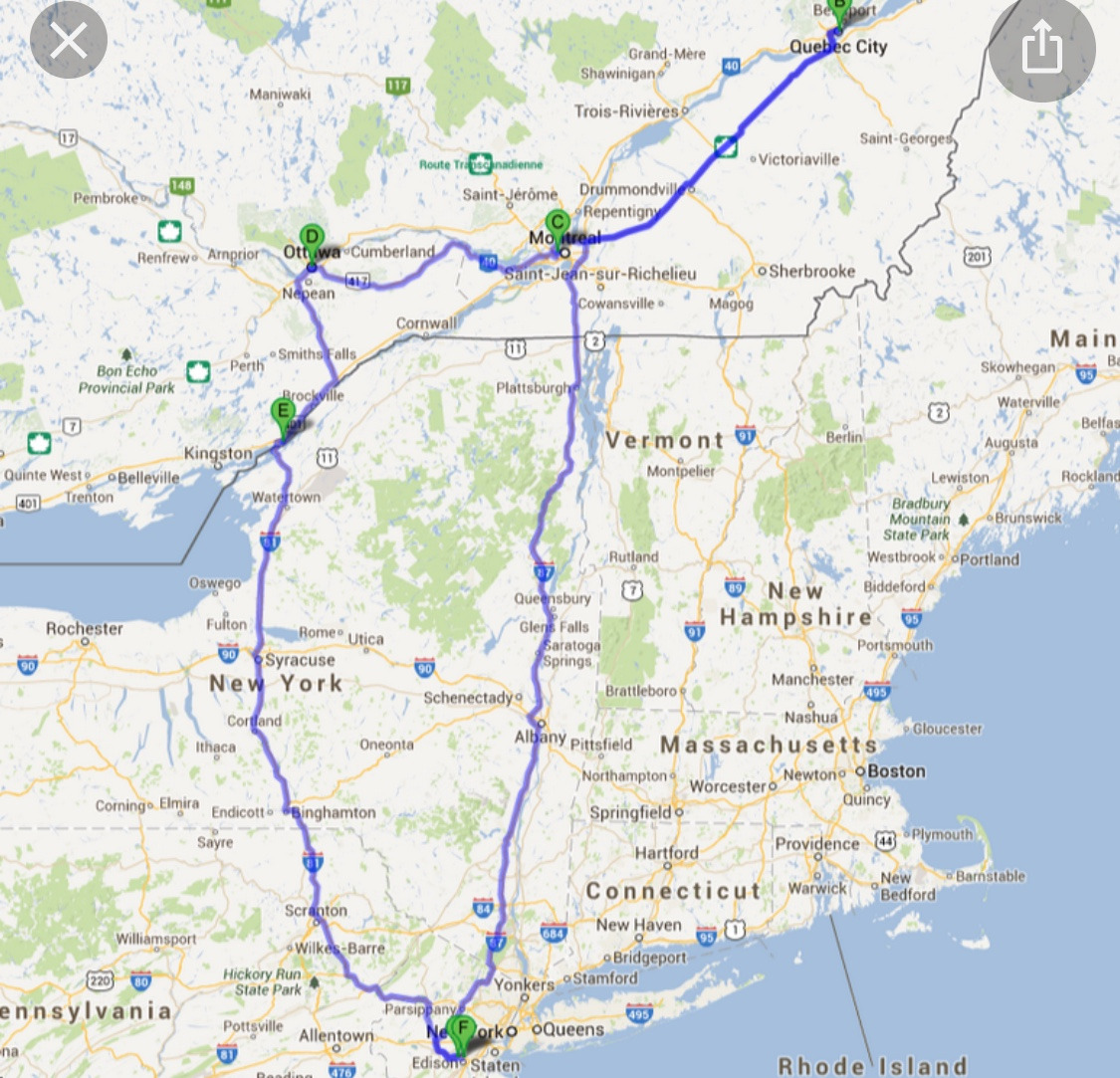 Happy Valley-Goose Bay까지 거리가 약 500km로, 만약 뉴욕시에서 차로 출발해서 나이아가라 폭포를 거쳐 토론토와 퀘벡시를 보고 Happy Valley-Goose Bay까지 간다고 가정하면,