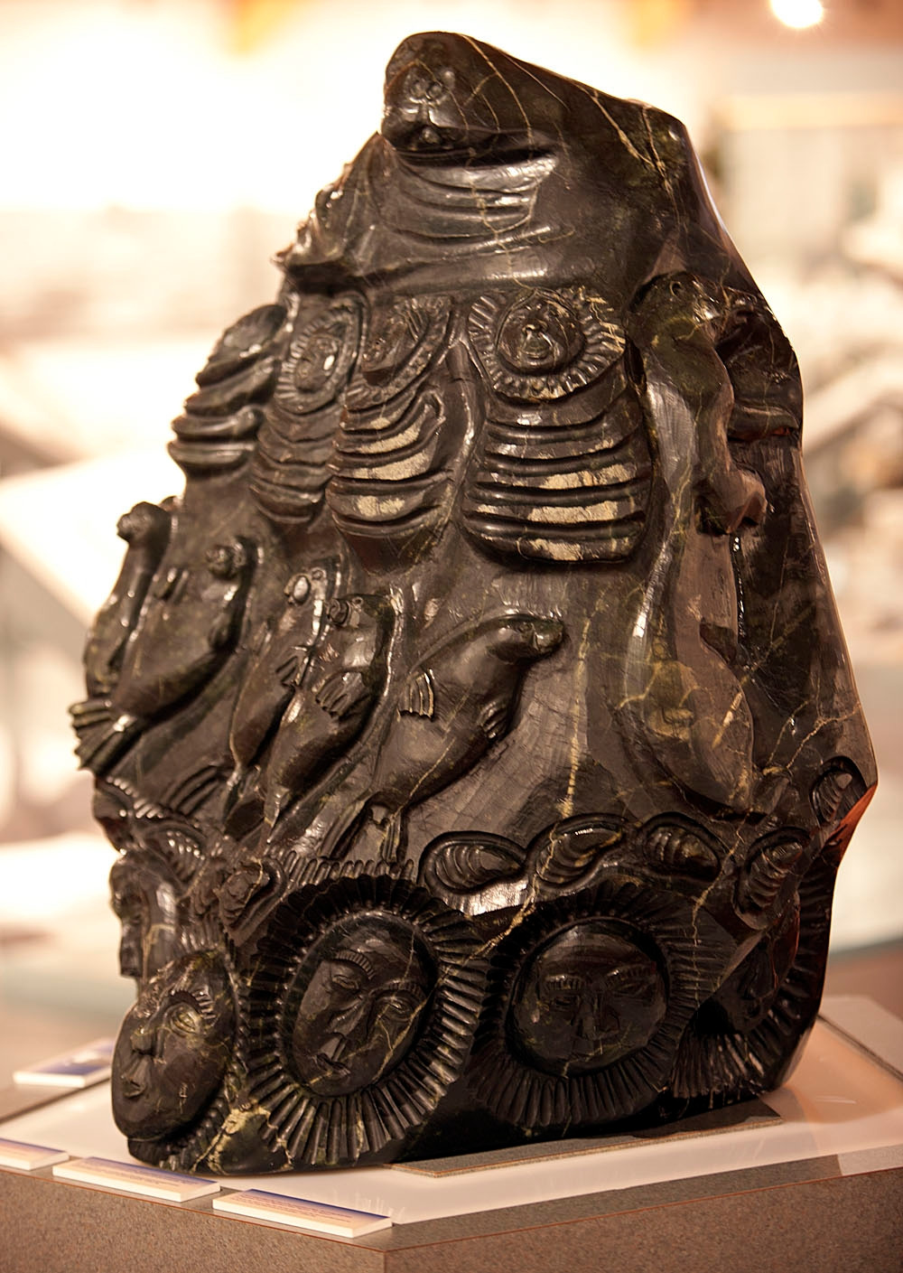 돌을 다듬어 전면에 각종 형상을 조각해 놓았다.