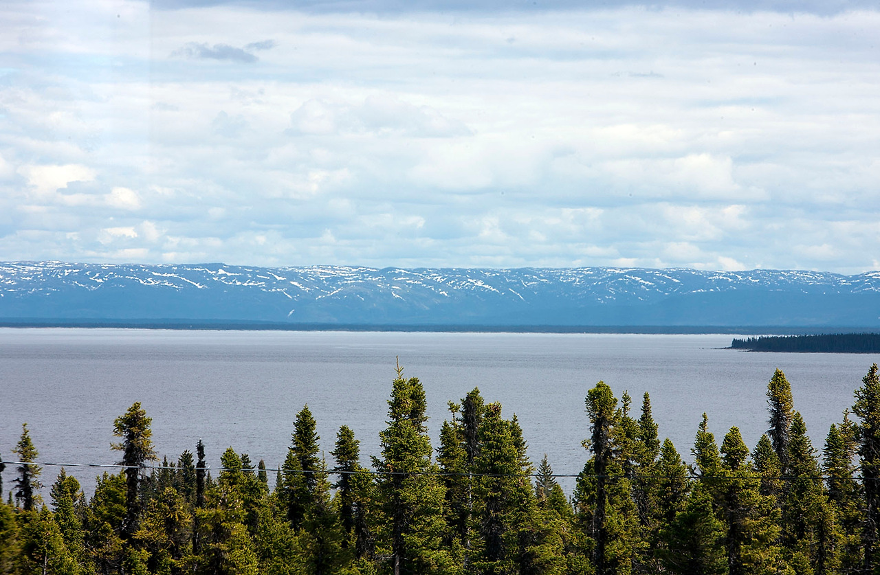 전시관 이층에 올라가면 전망대가 있어 앞뒤 쪽으로 잡은 풍경. LAKE MELVILLE로 바다같이 큰 호수가 길쭉하게 옆으로 퍼져있다. 먼 산에는 여름에도 녹을 줄 모르는 만년설이 끝없이 산자락을 수놓고 있었다. -jh-