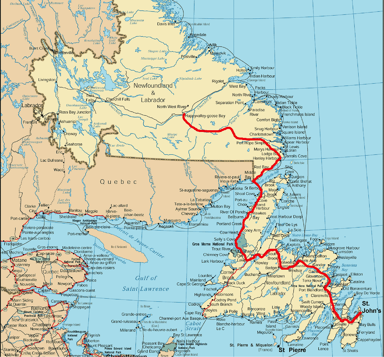 호수 안 페리 영감님 집에서 이틀을 보내고 난 오늘 아침에는 하늘이 두 조각나더라도 다시 뉴펀들랜드로 나가야 한다. 아래 지도에서처럼 Goose Bay에서 비포장도로를 따라 뉴펀들랜드 건너가는 페리보트 타는 곳 Blanc-Sablon까지 거리가 정확하게