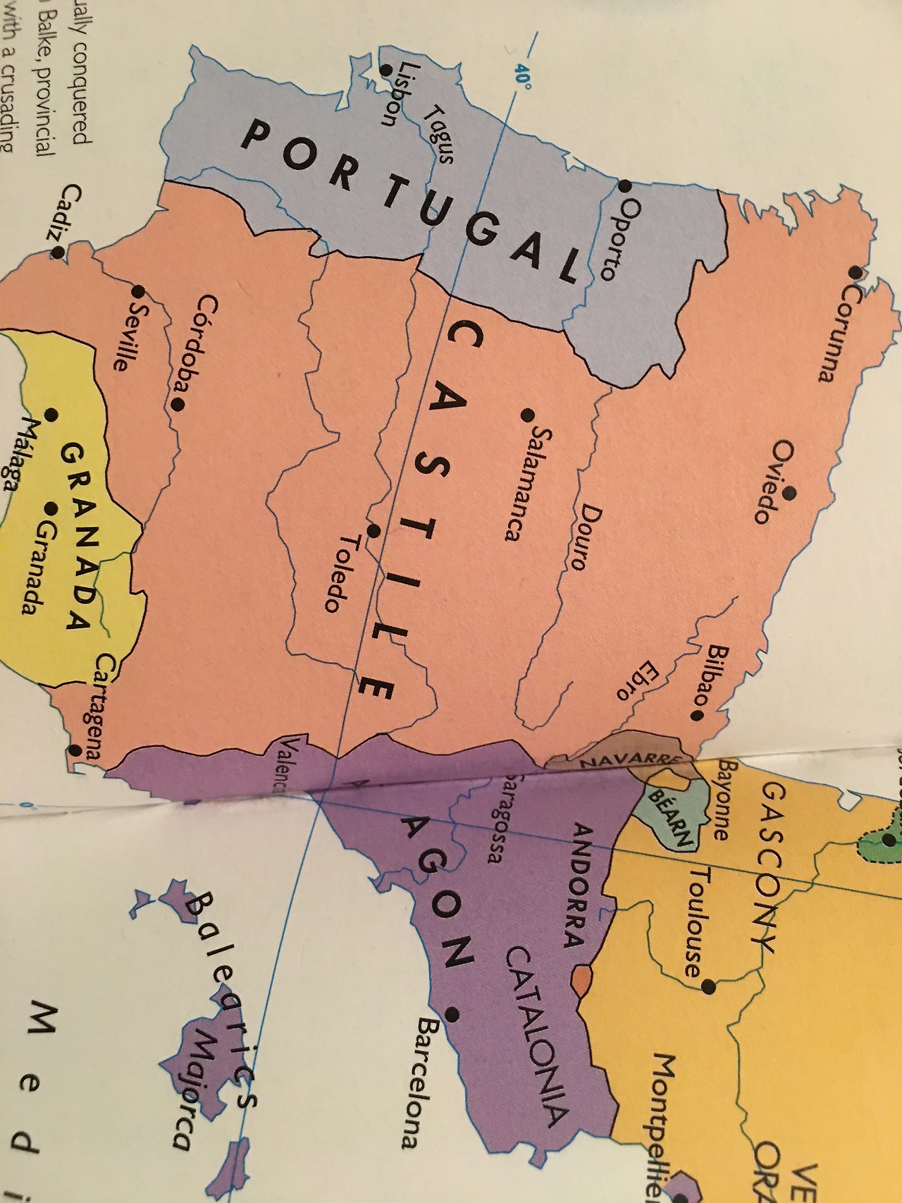 갖고 있는 세계사 책에서 발췌한 지도로, Ad 1400년경 이베리아 반도를 분할 통치하고 있던 왕국들의 영토를 표시하고 있다. 이때까지만 해도 스페인이란 국호는 찾아볼 수도 없었고 카스티야(Castile) 왕국이 톨레도를 중심으로 번성하여 가장 넓은 영토를 개척하였고, 그 오른편으로 바르셀로나를 거점으로 한 아라곤(Aragon) 왕국이 강성하였고, 그 아래로 그라나다를 중심으로 이슬람 세력의 그라나다 왕국이 아름다운 알람브라 궁전의 추억을 간직하며 삼파전으로 통치되어오다, 1469년 아라곤 왕 페르난도와 카스티야 여왕 이사벨과의 결혼으로 연합왕국이 탄생되었고, 1492년 카스티야 연합왕국이 그라나다 왕국을 정복함으로써 이베리아 반도에 에스파뇰이란 통일국가가 탄생하게 되었다. 지도에서 보는 것처럼 그 당시에는 마드리드란 도시는 없었다.