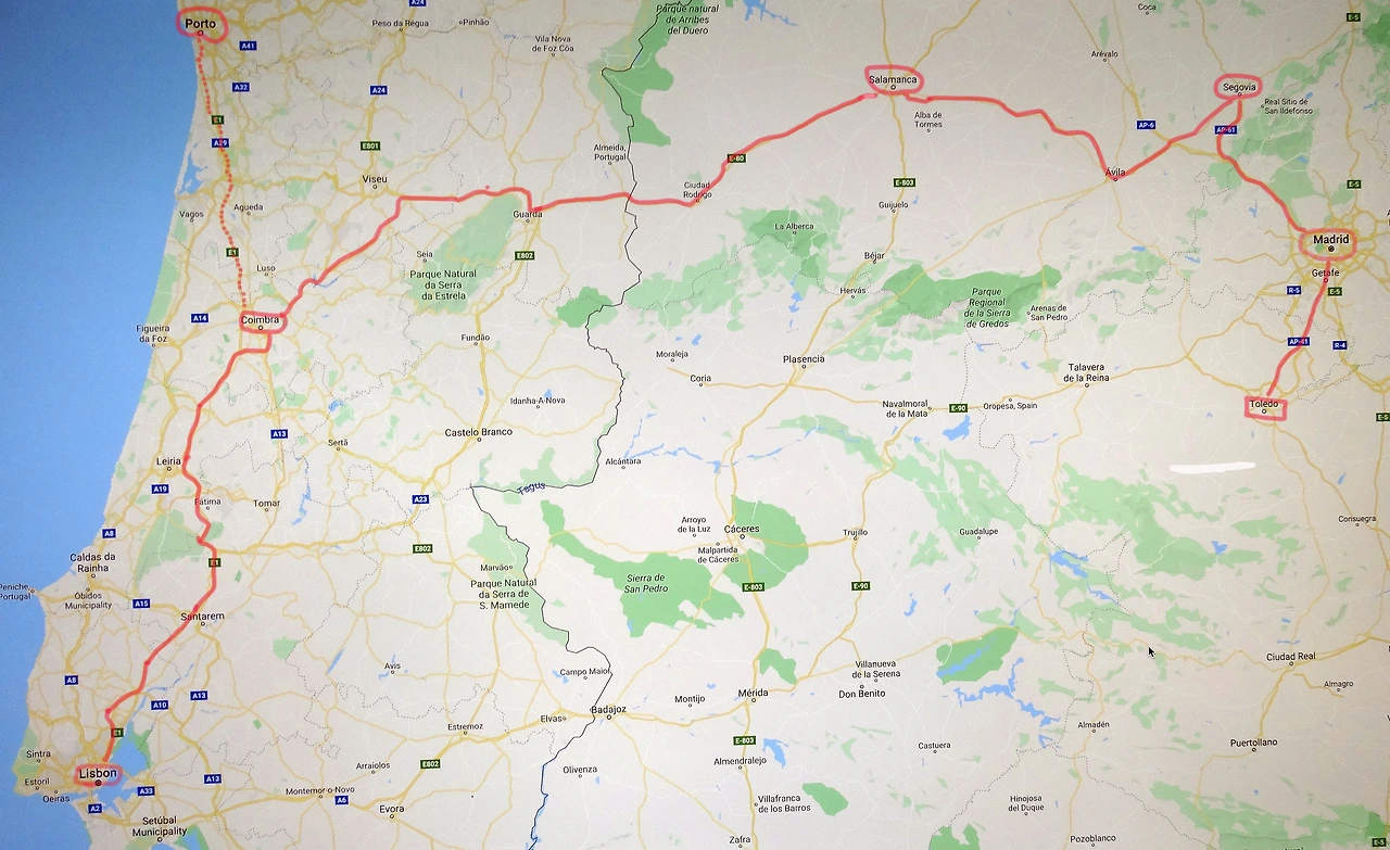 스페인 마드리드에서 포르투갈 리스본까지 구글 지도로 최단 거리를 찍어 보았더니 630km에 6시간 정도로 나왔다. 중간에 다른 구경거리가 있는지 챙겨보니 Segovia와 Salamanca가 나왔다.