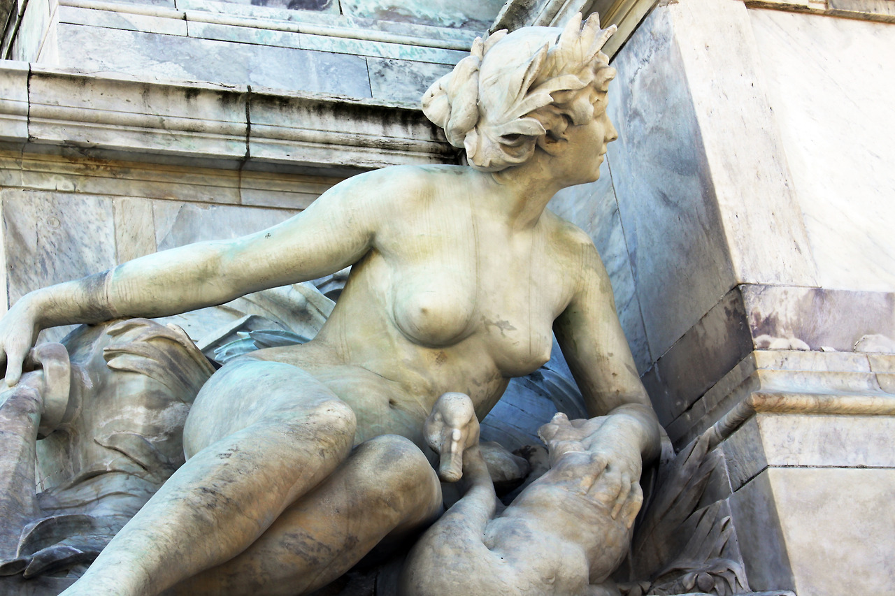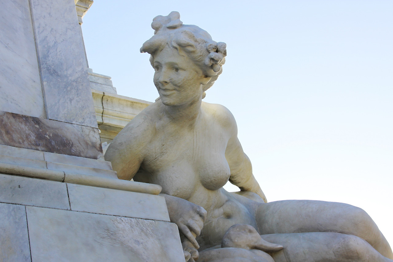 상층부에는 자유의 여신이 오른손에는 (속박을) 끊은 쇠사슬과 왼손에는 자유의 상징인 올리브 나뭇잎을 들고 있고, 아랫부분 분수대에는 승리를 상징하는 여러 조각들이 새겨져 있다. 이런 분수대 조각상을 제조하는데 구리만 총 52만 톤이 소요되었다고 한다.