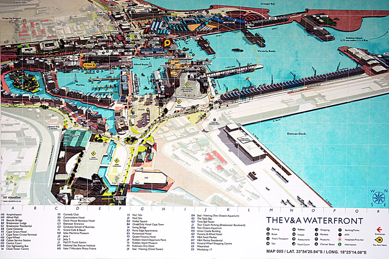 V & A 약자는 미국 Virginia 주를 말하는 약자 VA가 아니고 Victoria여왕과 아들 Alfred의 첫머리 글자를 각각 따서 붙인 이름이라고 한다. Alfred 이름이 들어가는 이유가 1860년 당시 젊은 왕자였던 Alfred가 Waterfront project을 구상하여 공사를 시작하였기 때문이다. 그리고 여기가 케이프타운 관광의 출발점이다. 관광객들이 제일 많이 이용하는 뚜겅없는 이층 시내 관광버스의 출발점이 이곳이다. 그리고 인근 섬으로 가는 페리보트의 선착장도 여기에 있고 대형 쇼핑몰과 고급 및 중급 레스토랑도 전부 여기에 모여있다. 캐이프타운에 오게되면 여기를 거치지 않으면 다음 관광코스를 어디로 할지 정할 수가 없다. 한마디로 엄청나게 붐비는 곳이다. 아마 케이프타운 시티에서 제일 많은 관광객들이 뿍적거리는 곳이 여기일 것이다. 쇼핑할 곳도 많다보니 관광객이 지나가는 이곳 저곳 거리에는 재미있는 길거리공연이 하루 내내 펼쳐지는 곳이기도 하다. 마술공연부터 거리밴드, 아카펠라(무반주 합창단)공연, 색스폰 연주등등 하루가 심심치않게 펼쳐진다.