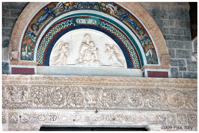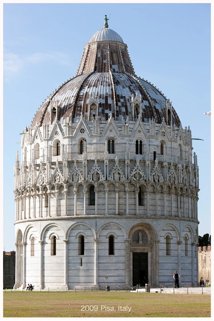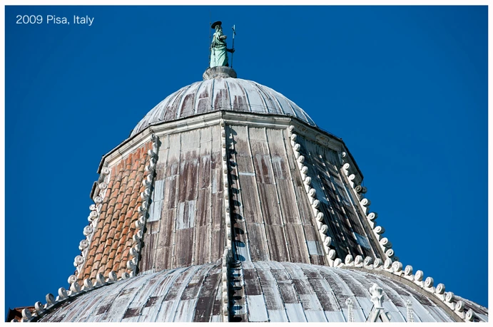 피사 탑 상층을 줌렌즈로 잡은 모습으로 와서 보니까 탑이 기울여 있는 것은 설계 잘못인데 그걸 알면서도 그냥 끝까지 밀고 간 것 같았다. 지반이 모래가 포함된 진흙으로 3층을 올리기 전부터 탑이 조금씩 오른쪽으로 기울기 시작했다고 한다. 그리고 탑을 지탱하는 추축 돌이 7층 탑의 총무게를 지탱하기에는 좀 얇은 돌로 되어 있단다. 그럼에도 불구하고 180년 동안 공사를 계속 밀어 부친 것은 앞의 책임자가 가고 나면 뒤에 남은 책임자는 별로 부실공사에 대한 책임도 없어니까 그렇게 해서 180년 동안 공사가 계속 이어진 것 같았다.
