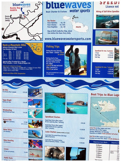 이게 전부 2009년도 가격이니까 다음에 가 볼 사람들은 가격 숙지해서 가도록. 재미있는 레저들이 여기 다 있다. 다른 섬들 이름이 나오는 것 보니 배타고 나가면 다른 섬으로 갈 수 있는 모양이다.