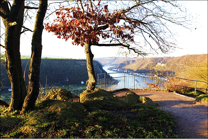뱀꼬리처럼 굽이쳐 흘러가는 라인강이 낙조에 조금씩 붉게 물들기 시작한다. 왼쪽 산아래로 차도로와 기찻길이 보인다. 강 따라 길이 함께 굽이쳐 흐른다.