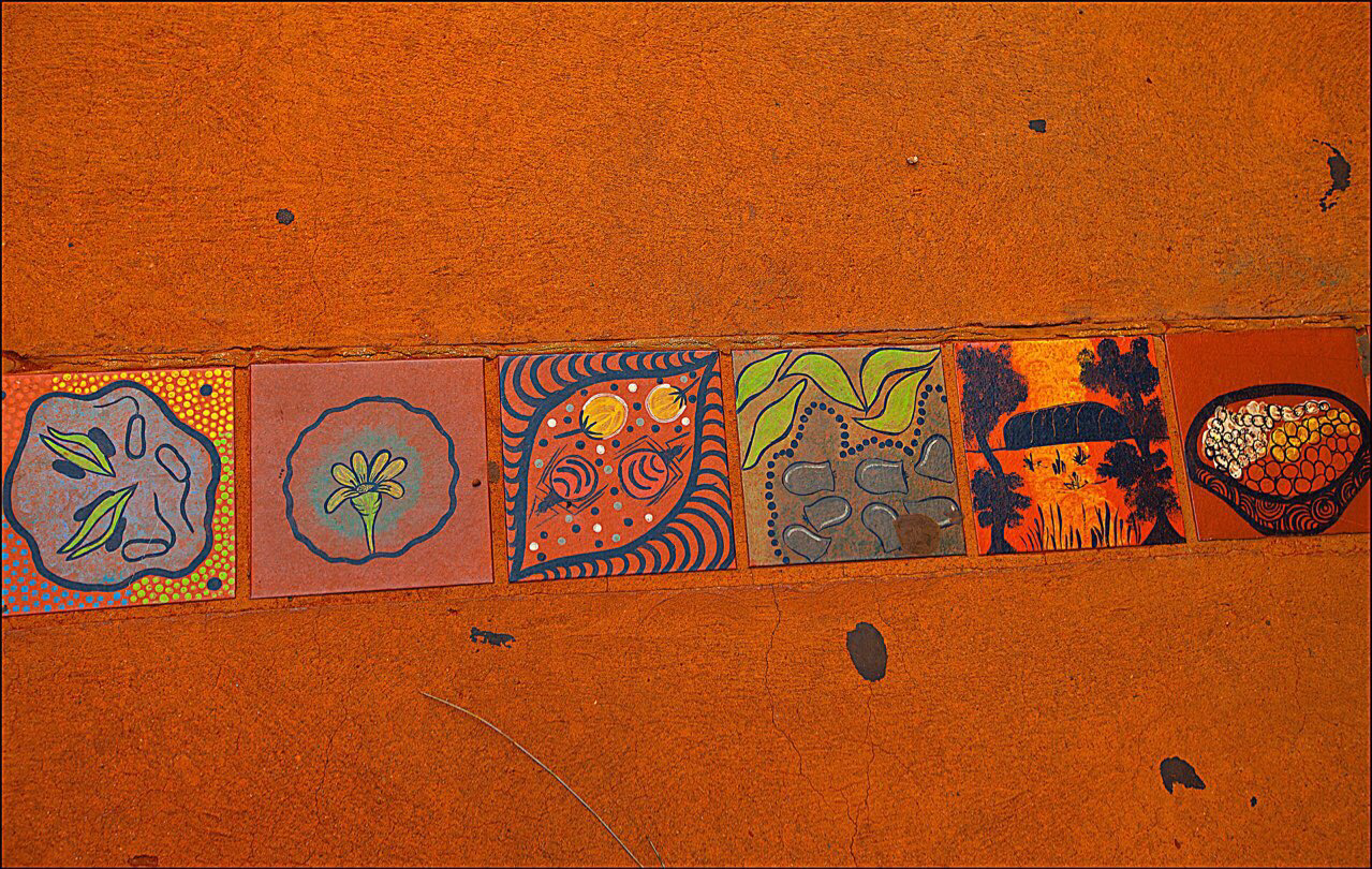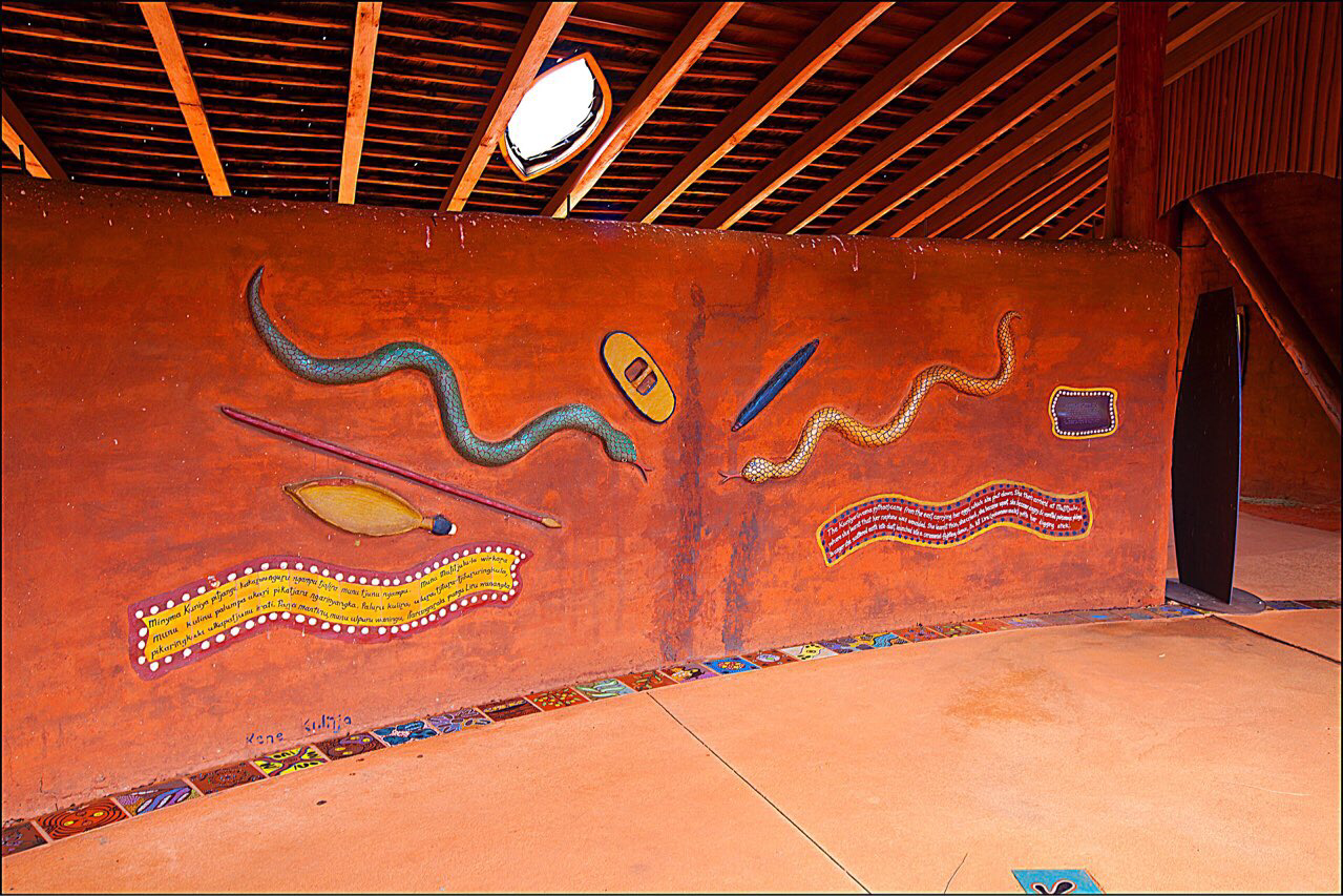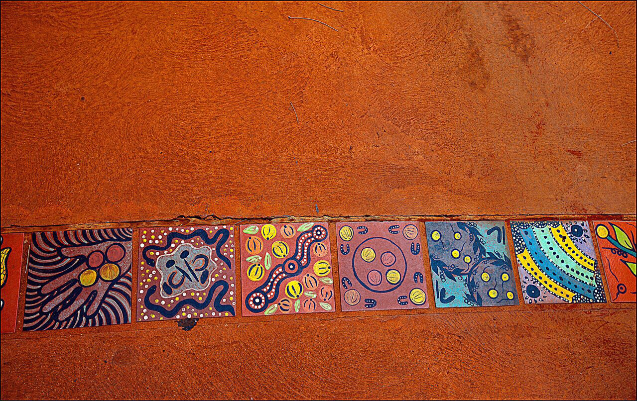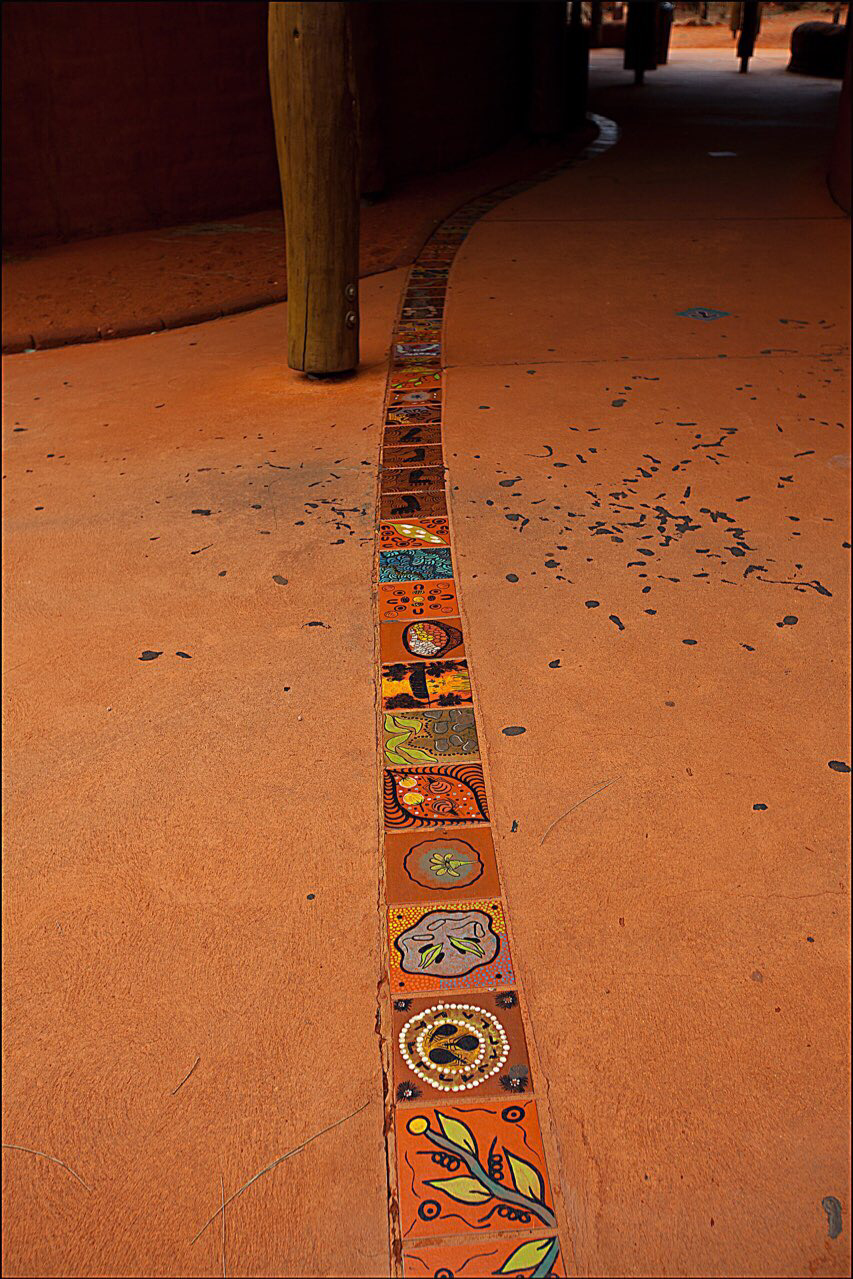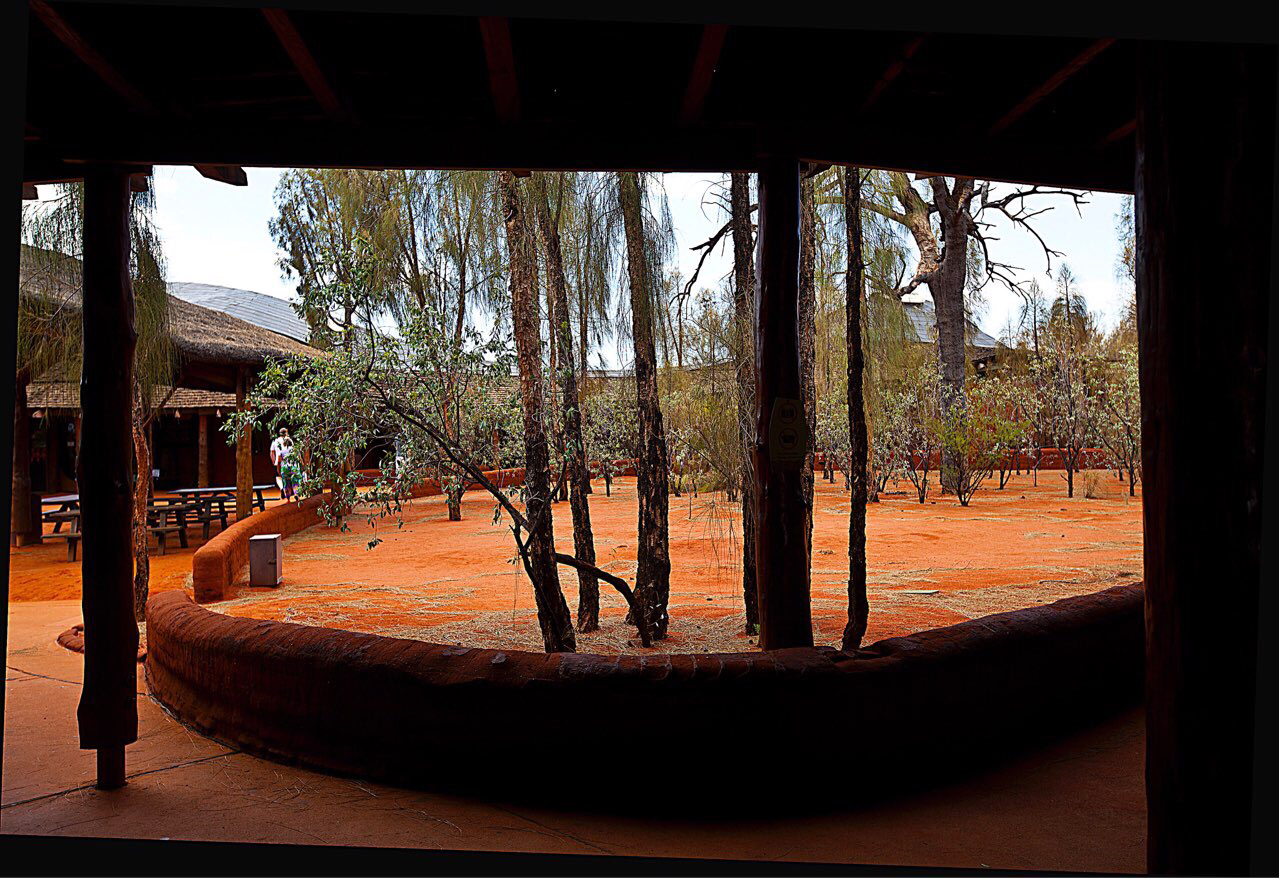 Culture Center의 구조가 그들의 전통적인 생활방식으로 오밀조밀하게 잘 조성되어 어디서 봐도 운치가 있게 나무와 장식물들이 조화를 이룬다. 그들만의 독특한 무늬와 형태로 타일에 그림을 그려 바닥에 장식하였다. 하나하나에 각 그림이 표현하는 의미가 있을터인데 그것을 모르더라도 우리는 그저 그냥 보아도 좋다. 걍 길에서 길로 이어진 예술작품들로 예쑬이야 예쑬!을 연발케 한다. 또 벽면은 그들 전통의 그림으로 장식되어 있는데 황사와 흑사가 이곳 원주민 Anagu에게는 아주 특별한 의미가 있는 것 같다. 어디서나 등장하는 수호신처럼 아마도 부족을 보호하는 영물처럼 보인다. 붉은색의 외벽, 바닥 그리고 나무 기둥들이 Northern Territory의 색을 그대로 보여주고 있는 것 같다.