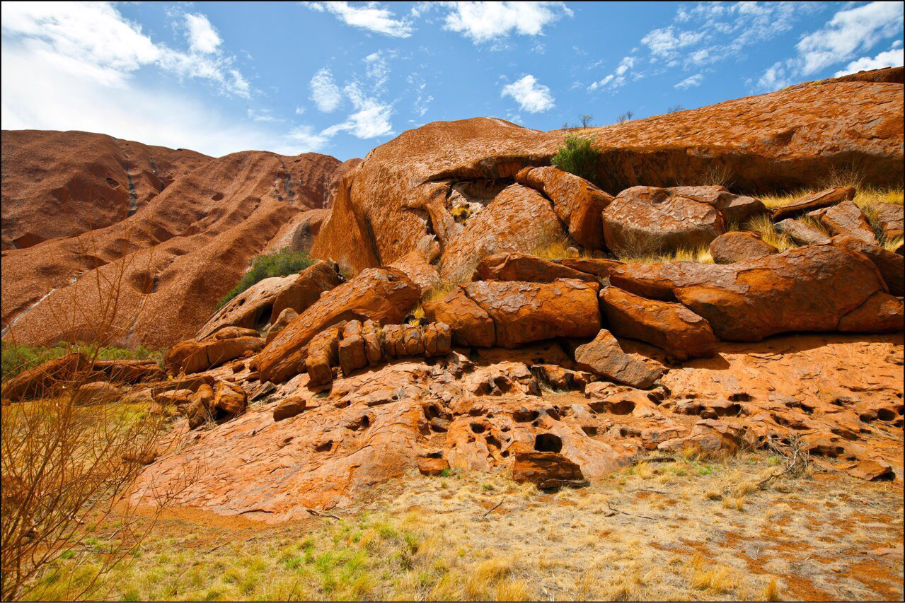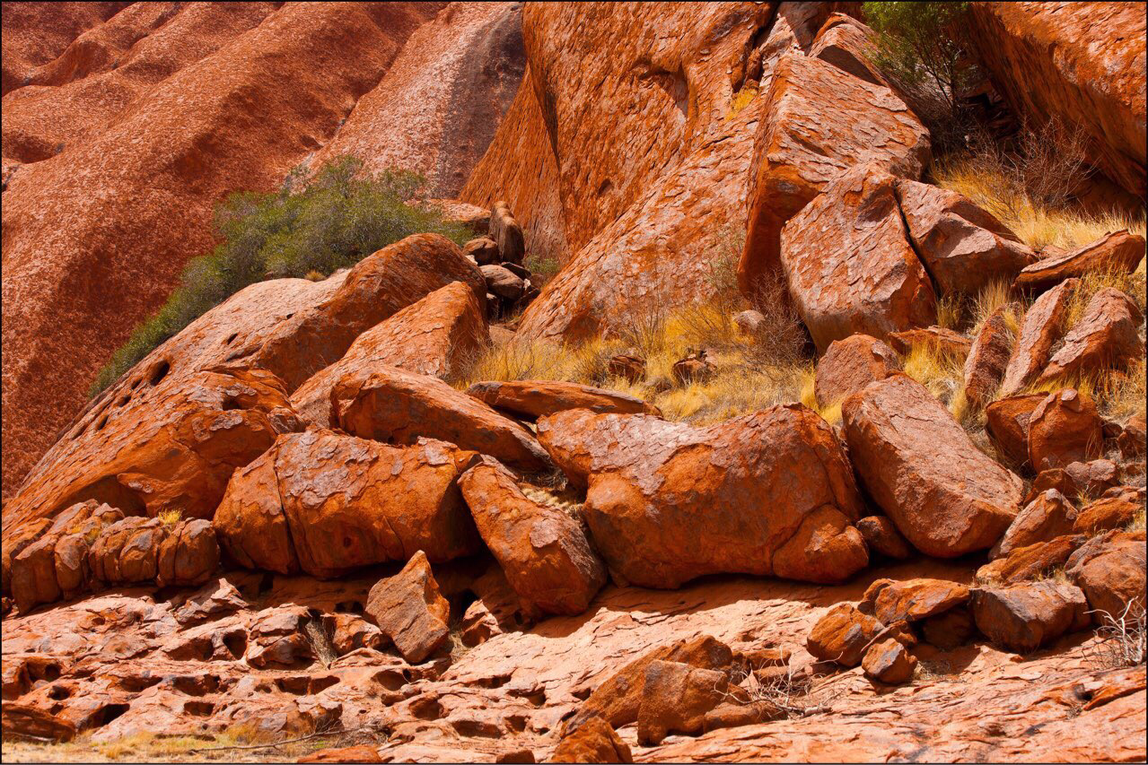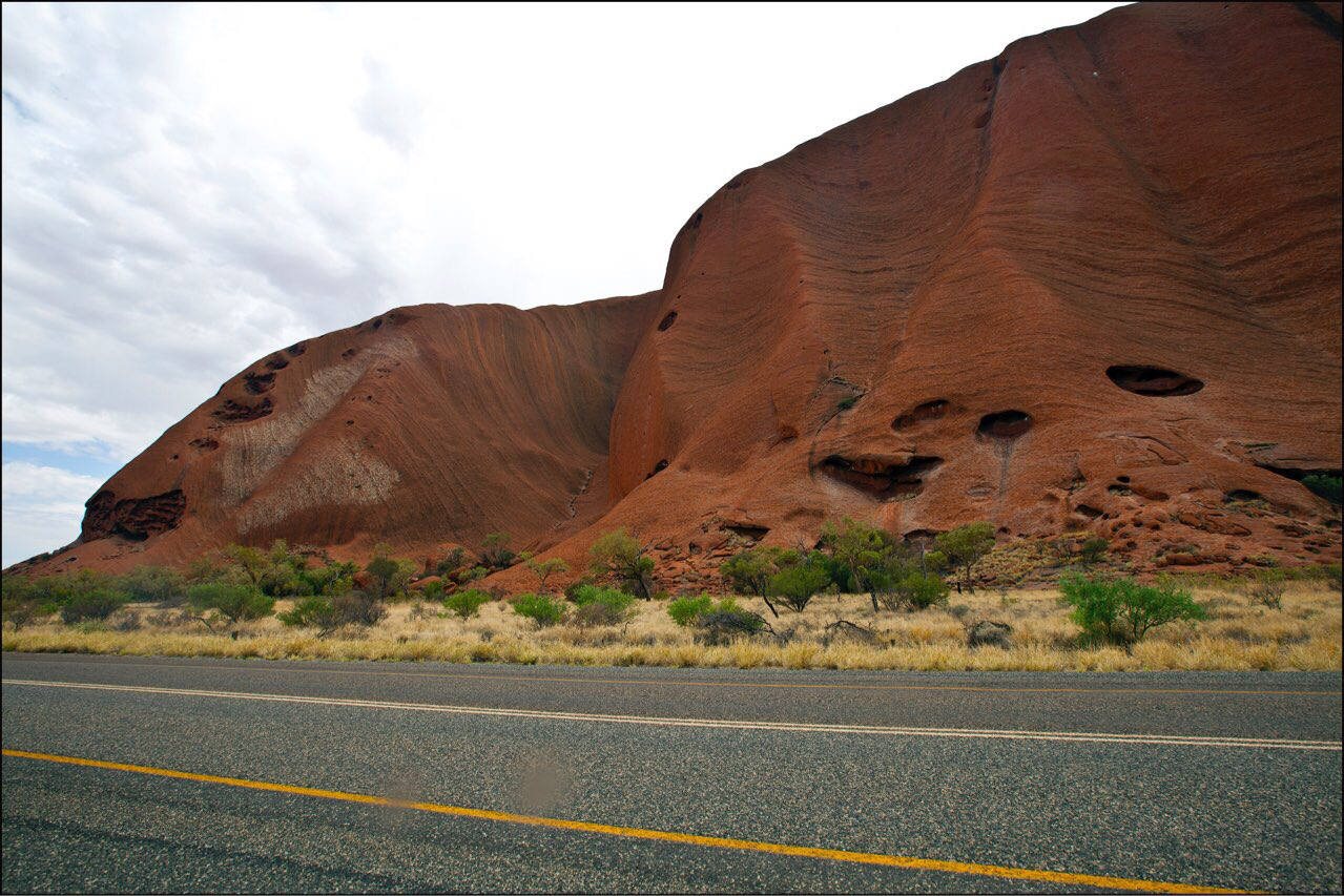 Mala Walk의 출발점에서 울룰루바위를 보면 상당히 낮아 보인다. 실제로 정상이 348 미터 밖에 안되니 낮게 보인다. 멀리서 볼 때는 바위뿐인줄 알았는데 가까이서 보니까 바위가 깨지고 구멍도 나고 그 틈새로 들풀도 자라나는 것을 볼 수 있다. 산 전체를 보면 나무 하나하나는 볼 수 없고 대신 산속에 들어와서는 나무 한그루는 자세히 볼 수 있으나 전체 산은 볼 수 없는 것과 마찬가지다. 그리고 지면과 맞닿은 부분에는 여러 조각으로 쪼개진 돌방구들이 굴러 내려 그 사이로 노란 들풀들이 그 끈질긴 생명력을 과시하듯 머리를 꼿꼿이 밀어 내고 있다.