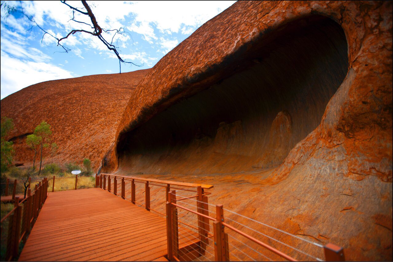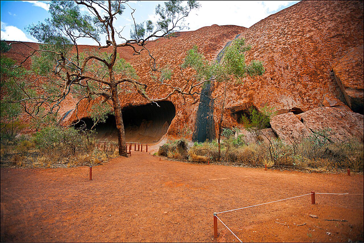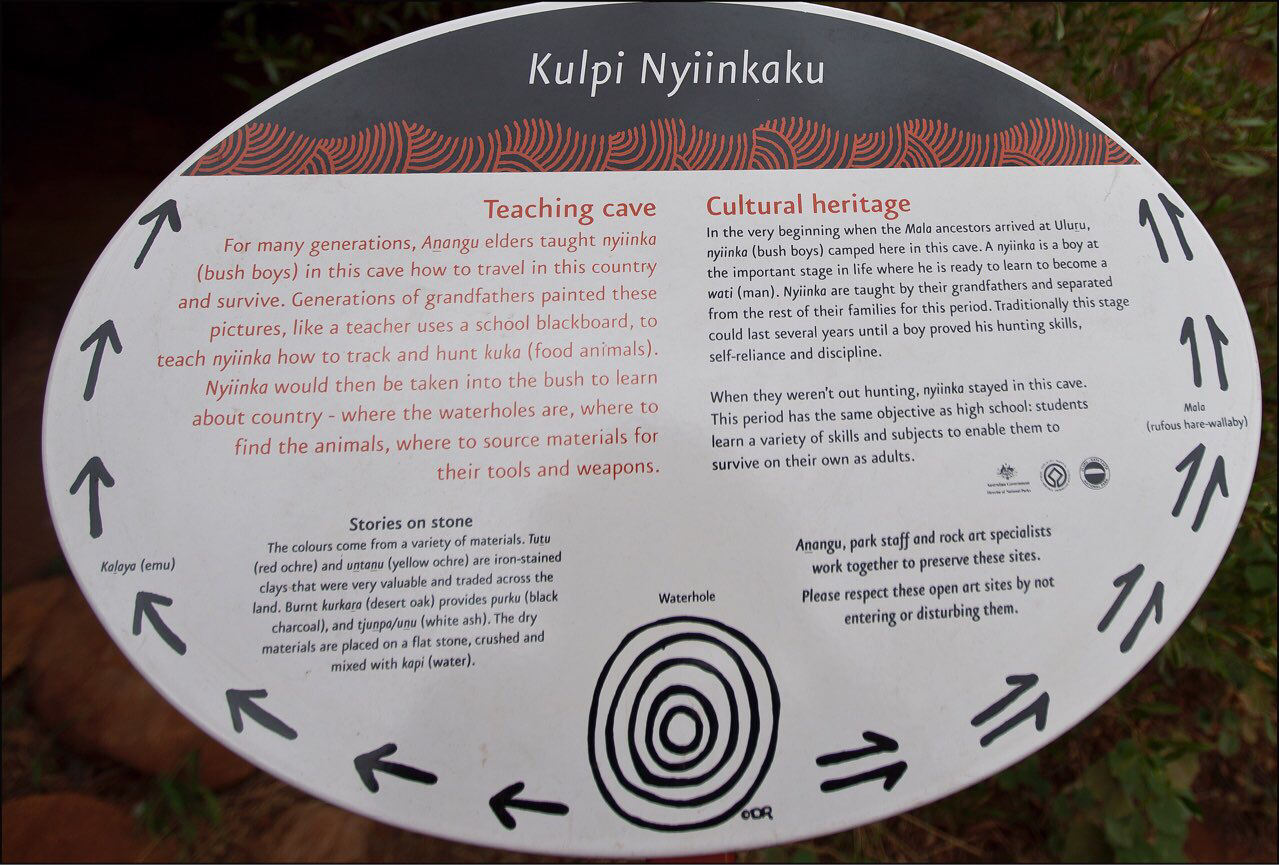 Wati는 남자 화장실 문에서 본적이 있다. Waticu는 Wati의 소유격인 모양이다. Kulpi는 동굴이란 단어이고. 읽어보니 내용인즉, 북에서 내려온 Mala People들이 울룰루 바위를 보고 제전을 지내기 적합한 장소라 생각하고 이 동굴에서 제사를 준비했다고 한다. 동굴 안을 자세히 구경하라고 동굴 가까이 나무Deck을 만들어 놓았다. 동굴은 깊지도 않아 겨우 비나 피할 수 있는 그런 정도이다. 동굴 벽에는그려진 그림의 흔적이 있는데 희미해서 정확하게 무슨 그림인지 알 수는 없다.