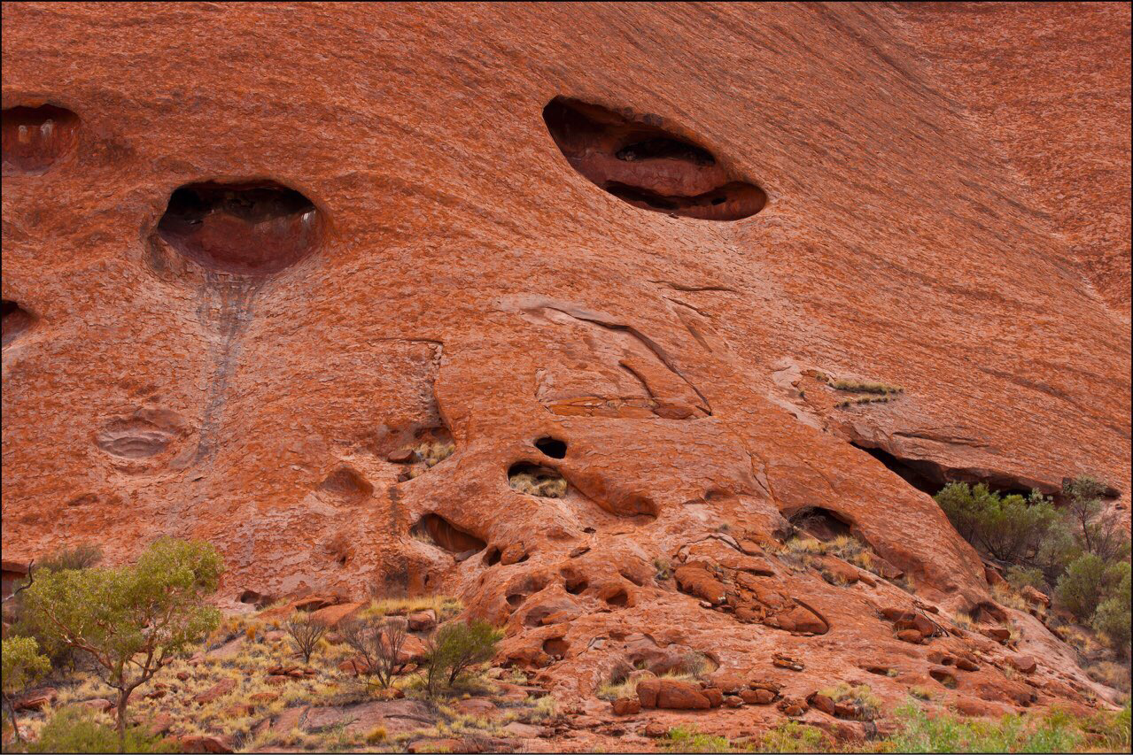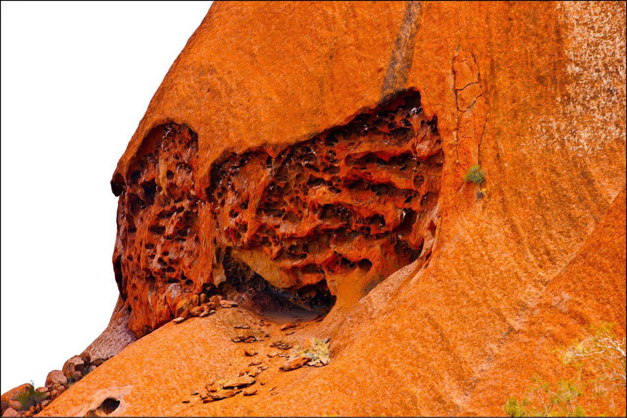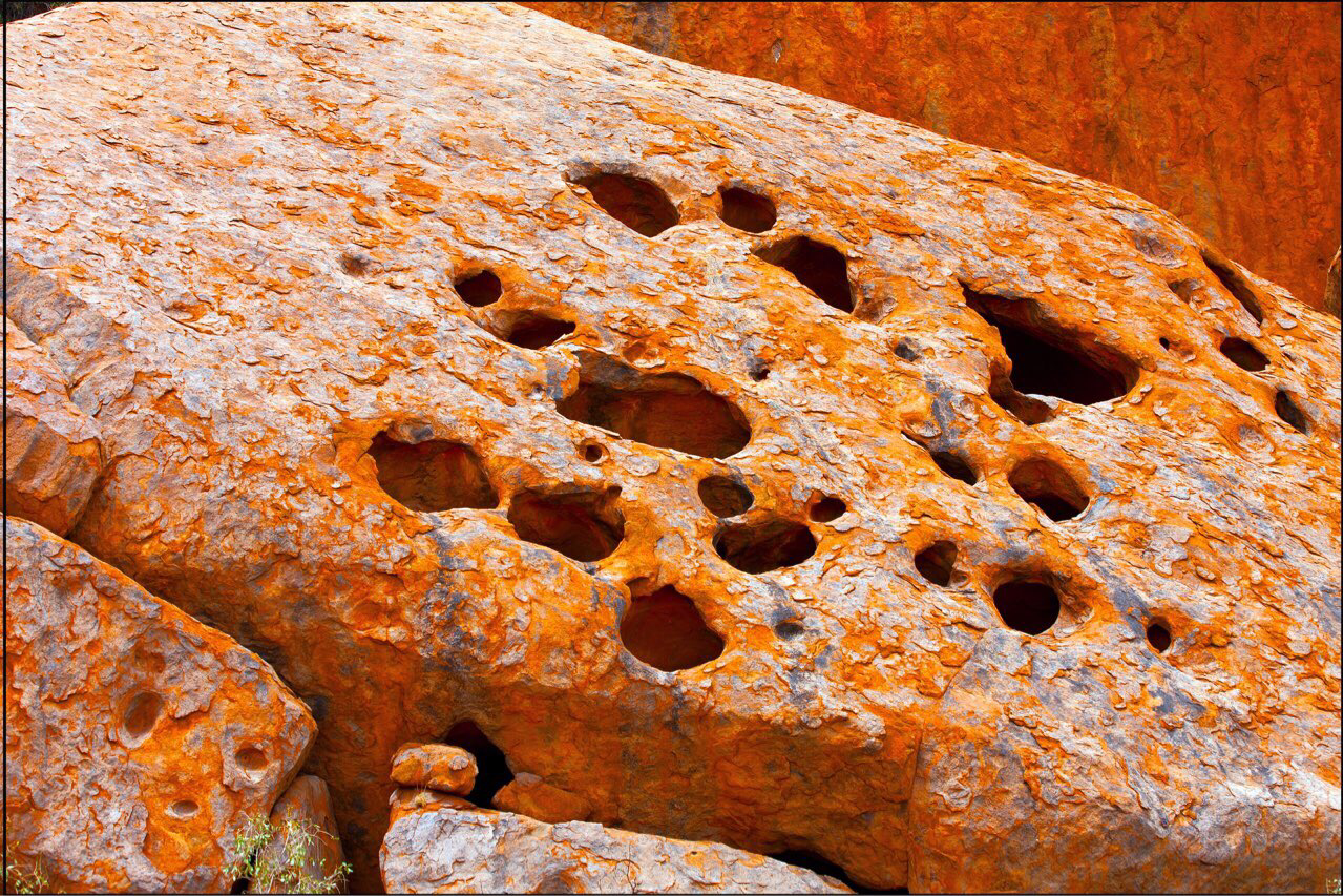 단단한 바위가 무슨 부스럼이 생겨 피부가 헐어지는 것 같이 표면이 문드러지고 있다. 알고보니 울룰루바위는 사암(Sandstone)이다. 억만년전에 호주대륙 전체가 바다밑이었다가 융기되어 지금의 섬이 되었다. 융기된 일부분이 풍화침식을 거쳐 울룰루 바위가 된 것이라고 한다. 그러니까 사암의 일부가 저렇게 피부헐듯이 헐어지고 있다는 것이다. 아마 저 부분은 다른 표면과 달리 그 옛날 해저층일때 좀 약한 지질층으로 이루워졌을지도 모르겠다. 어떤 부스름은 언뜻 보면 해골바가지가 땅에 반쯤 파묻혀있는 것 같다. 또 다른 부스름은 바위에 구멍이 숭숭난 것처럼 마치 녹썰은 양철판이 삭아서 그렇게 구멍이 뚫린 것 같았다.