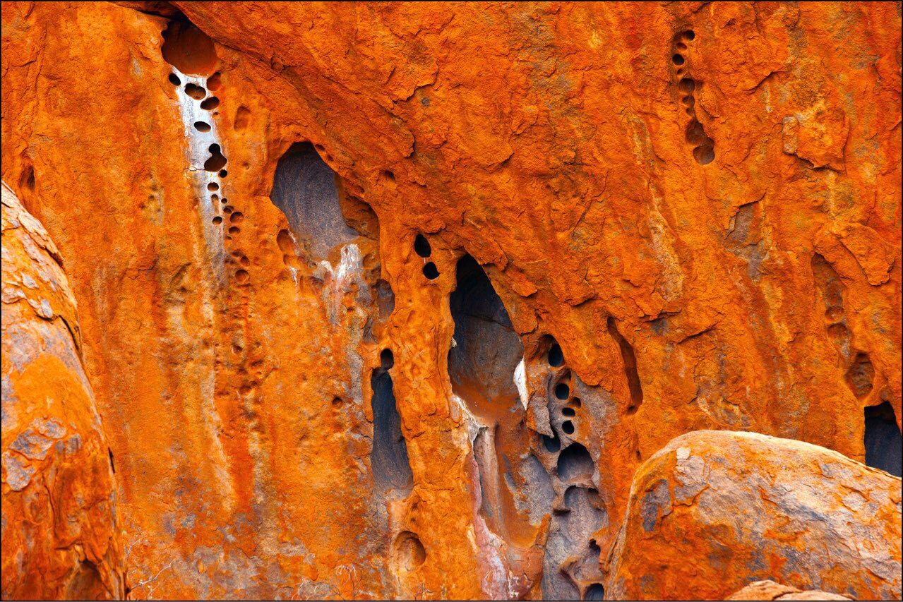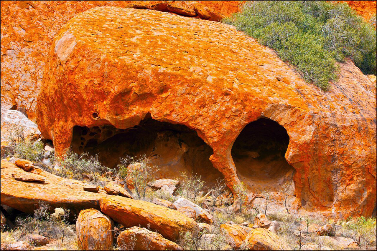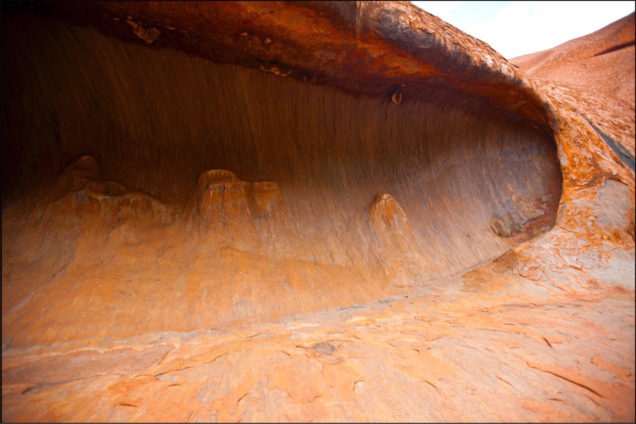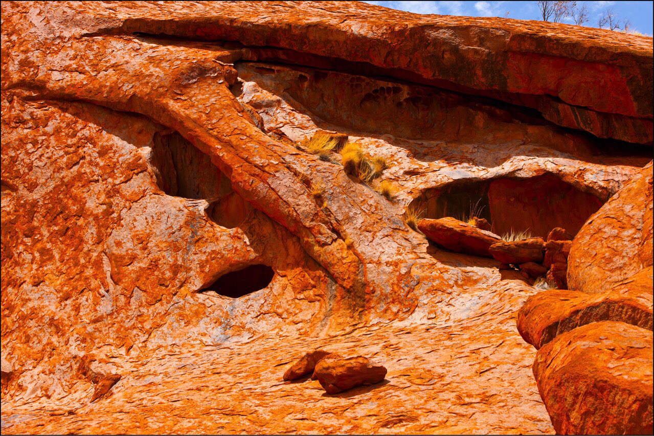 단단한 바위가 무슨 부스럼이 생겨 피부가 헐어지는 것 같이 표면이 문드러지고 있다. 알고보니 울룰루바위는 사암(Sandstone)이다. 억만년전에 호주대륙 전체가 바다밑이었다가 융기되어 지금의 섬이 되었다. 융기된 일부분이 풍화침식을 거쳐 울룰루 바위가 된 것이라고 한다. 그러니까 사암의 일부가 저렇게 피부헐듯이 헐어지고 있다는 것이다. 아마 저 부분은 다른 표면과 달리 그 옛날 해저층일때 좀 약한 지질층으로 이루워졌을지도 모르겠다. 어떤 부스름은 언뜻 보면 해골바가지가 땅에 반쯤 파묻혀있는 것 같다. 또 다른 부스름은 바위에 구멍이 숭숭난 것처럼 마치 녹썰은 양철판이 삭아서 그렇게 구멍이 뚫린 것 같았다.