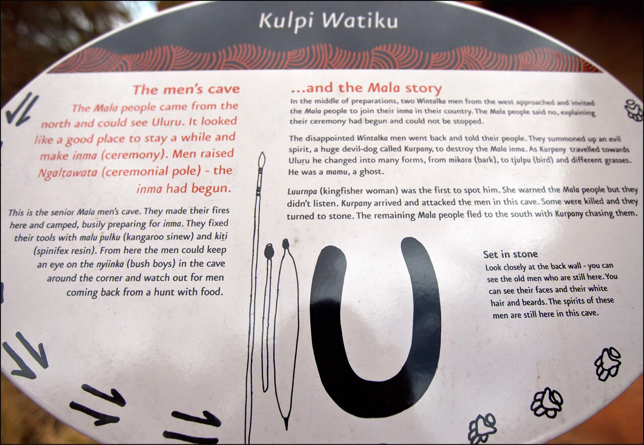 Mala는 여기 부족언어로 Hare Wallaby를 말하는데 캥거루의 일종으로 몸집이 작은 포유류 동물이다. 전통적으로 이 토끼왈라비가 Anangu부족들에게는 중요한 동물로 Mala People들이 울룰루에 살면서 현재의 이런 바위 형태를 만들었다고 전해지고 있다. 사막지대라 샘물이 거의 없어 원주민들은 바위에서 흘러 내리는 물을 받아 식수로 사용했다고 한다. 바위 표면에 있는 검은 색 줄기는 빗물이 흘러 내리는 길로 그 밑에 Waterhole이 있어 그들에게 식수공급원으로 사용되었다고 한다.