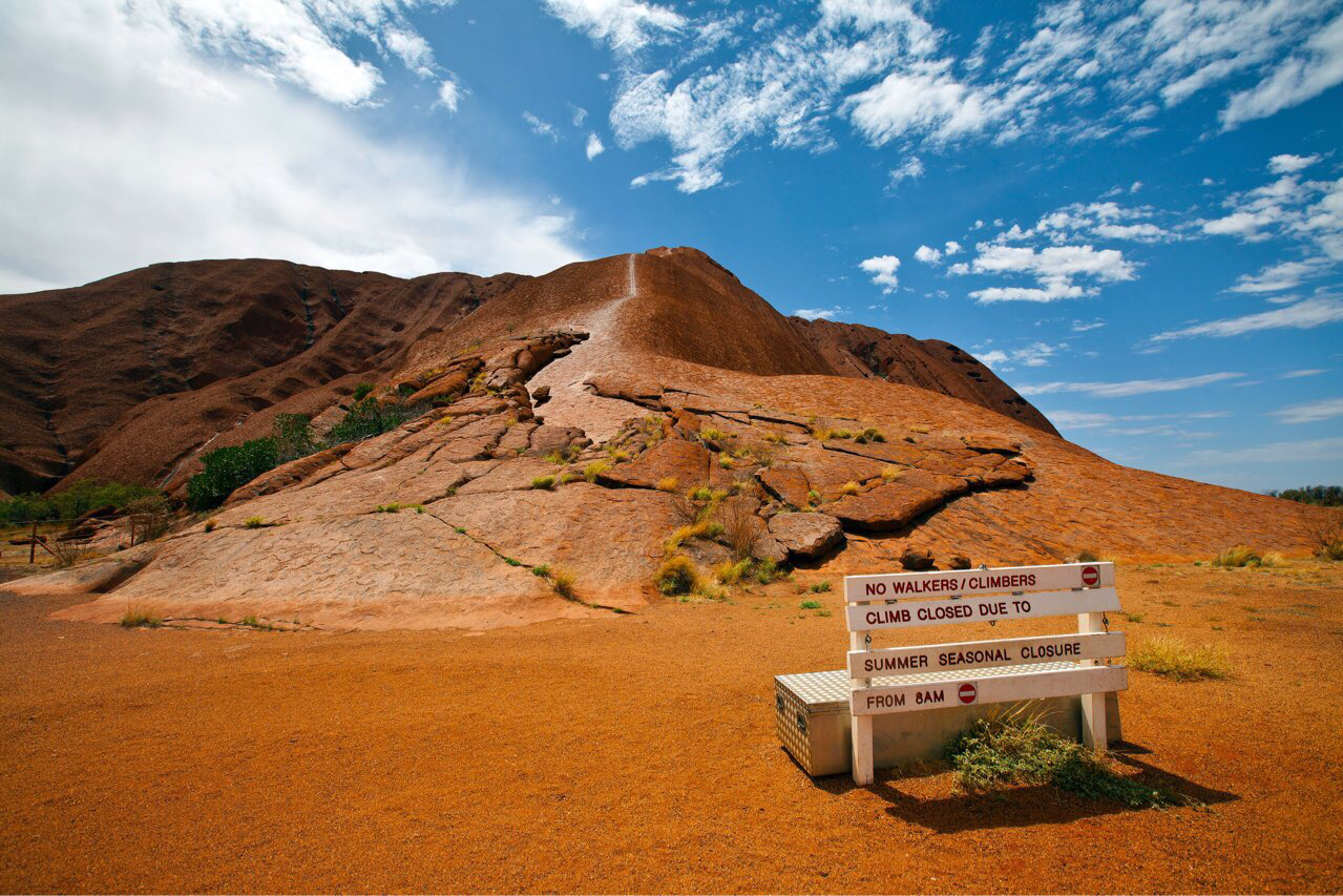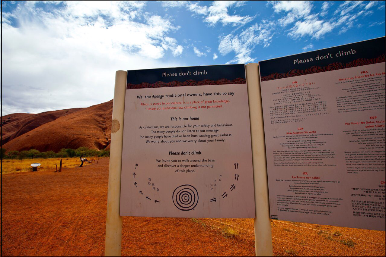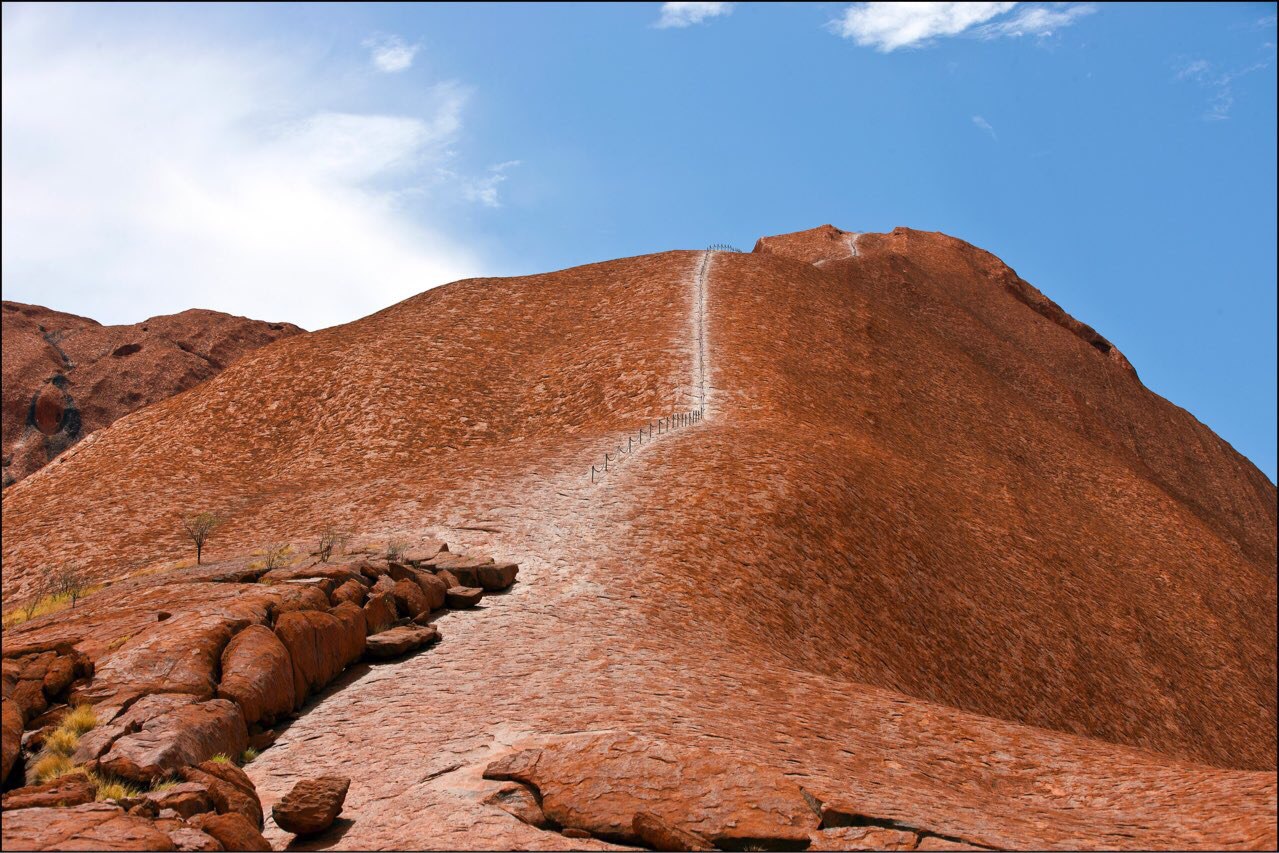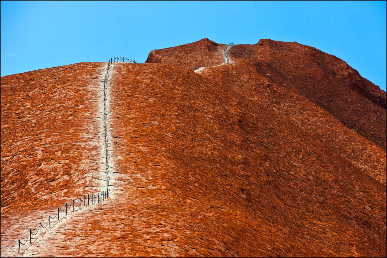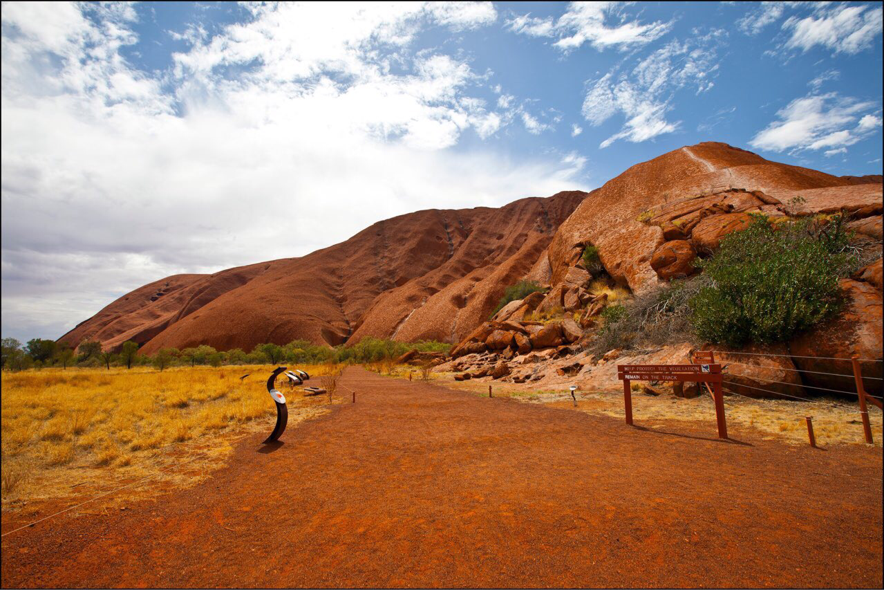 울룰루바위 중앙 지점에 있는 파킹장에 차를 대고 여기서부터는 걸어서 둘러봐야 한다. 바위 정상으로 올라 가는 길이 오늘은 페쇄되어 있다. 정상에 바람이 심하게 불거나 날씨가 더워 온도가 높은 경우에는 길을 Open 하지 않는다. 그러나, 정상으로 올라가는 입구에 여러나라 언어로 “우리집(My Home)"에 제발 올라 가지마라고 간곡하게 부탁하고 있다. 우리말 안듣고 올라 갔다가 크게 다치거나 죽을 수 있다고 다소 위협적으로 은근하게 경고한다. 하기사 부족들의 신전에 이방인들이 올라가서 이리저리 삐대고 돌아다니는거 하고 비슷한거니까 그렇게 부탁할만도 하겠다. 오늘은 날씨가 더워서 못 올라 가니까 우리도 별 고민할 필요도 없이 쉽게 접을 수 있었다. 파킹장에서 울룰루바위 정상으로 가는 길을 멀리서 바라보니 얼마나 많은 사람들이 올라 갔기에 붉은 사암바위에 사람들이 밟고 지나간 길이 하얗게 자죽이 뚜렷하게 새겨져 있다.