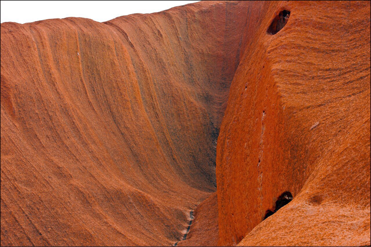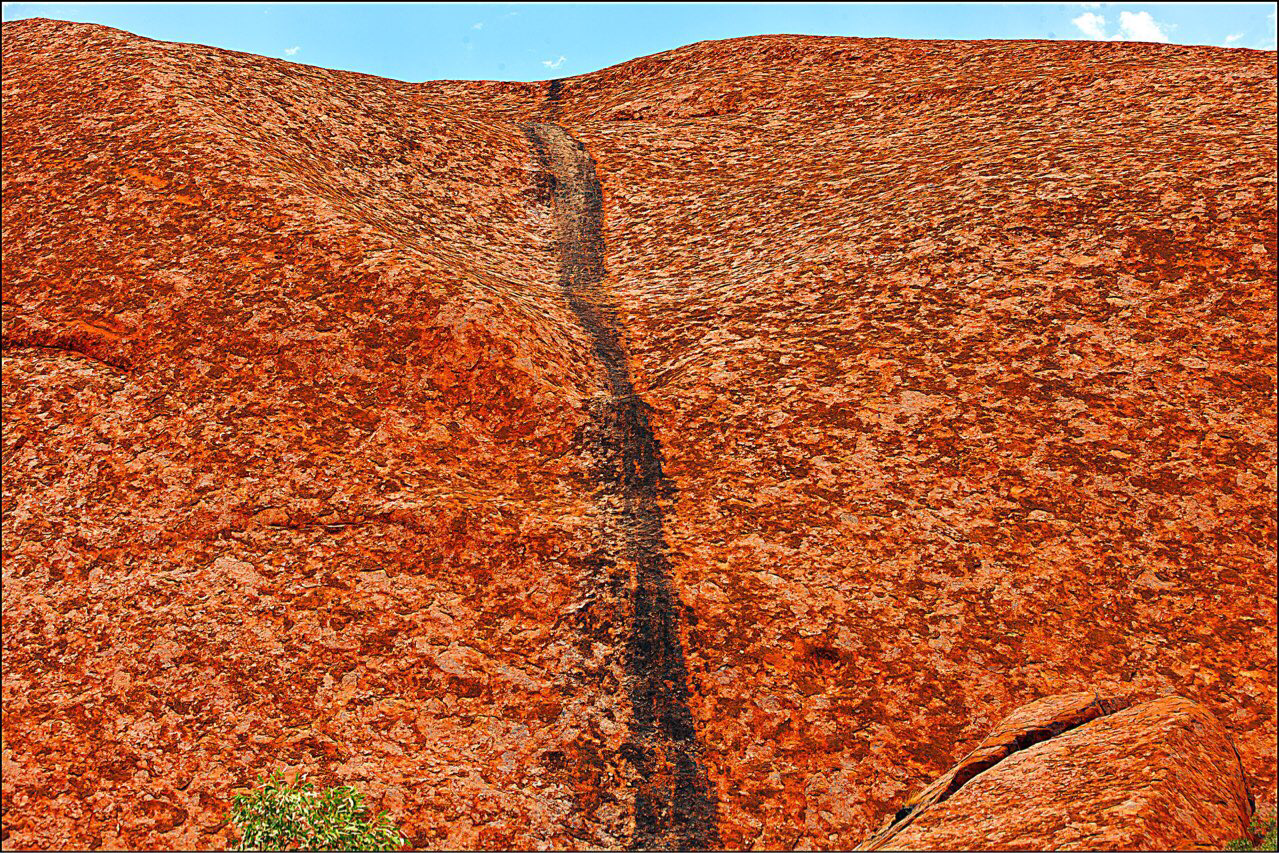 울룰루 바위의 부드러운 골짜기에는 검은 선이 선명하게 보이는데 빗물이 흘러 내리는 물고랑이다. 여행 안내서에 의하면 울룰루 바위가 시간에 따라 바뀌는 색깔로 유명하다고 한다. 일출과 일몰시에는 햇빛을 받아 Deep Red로 변하는데 비가 온 뒤에는 Shiny Black으로 변하고 비가 그치고 난뒤 빗물이 흘러 내리는 물고랑만 항상 검은색으로 변한다고 한다.