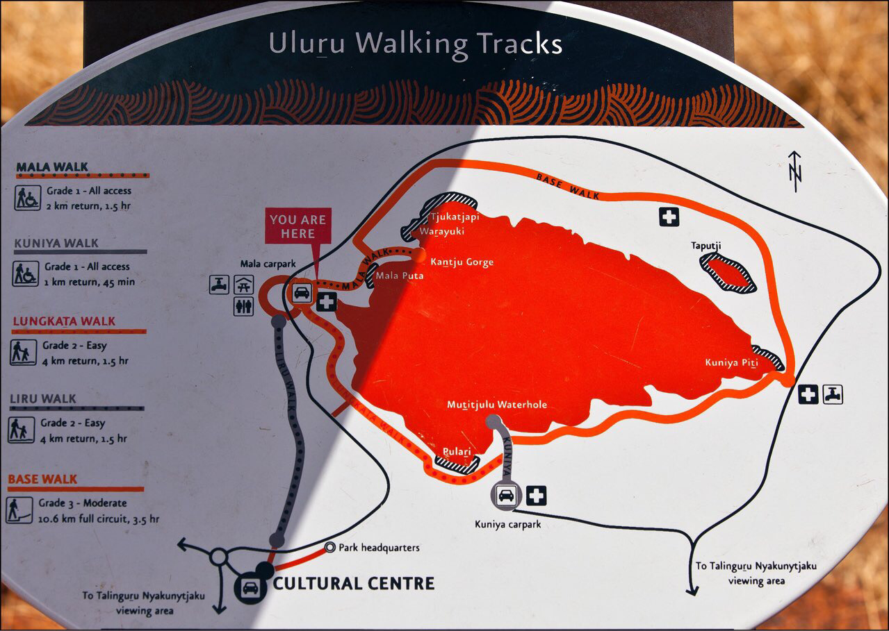 한국 시골 사립문을 연상케하는 Culture Center의 뒷문을 나오면 바위산으로 가는 트레일이 이어져 있다. 약도에 보듯이 Liru Walk로 4km나 되어 걸어서 가기에는 먼 트레일이다. 그래서 파킹장으로 돌아가서 차로 Mala Walk로 갈수있는 Mala Carpark으로 이동했다. 차로 Culture Center 파킹장에서 나와 Mala Carpark로 가는 길에 울룰루 바위 뒷면의 일부분을 자세히보니 바위 중간중간에 구멍이 숭숭 뚤려 동굴 비슷하게 생긴 모양들이 여러군데 보인다.