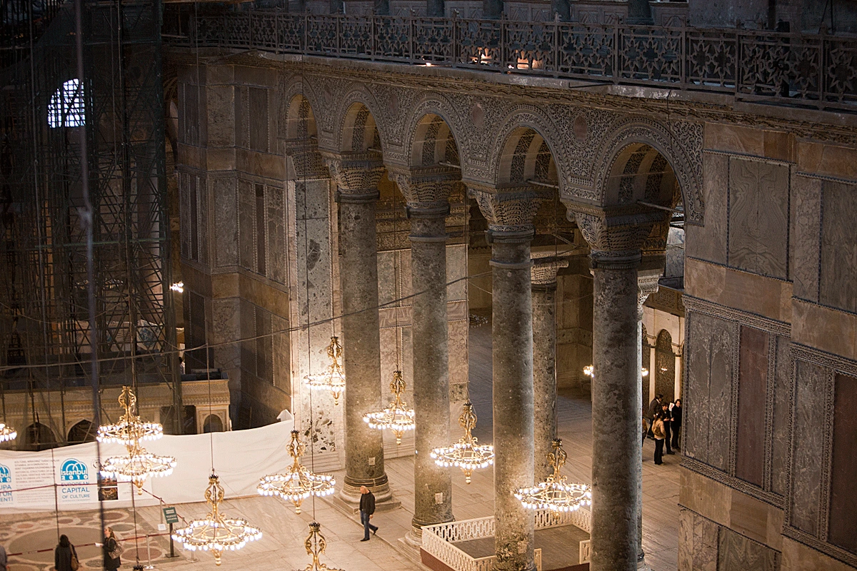 이층에서 입구쪽으로 내려다 볼 때 오른쪽 벽면의 기둥들. 정면 오른쪽에는 보수 공사가 한창이다.