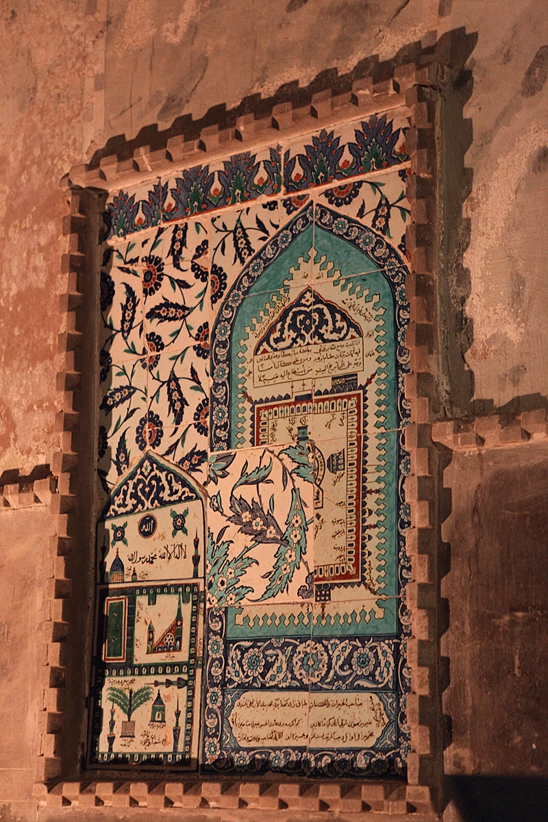 일층 정면 오른쪽 코너에 있는 타일 벽화인데 메카에 있는 holy kaaba 을 그려놓은 것이다. Kaaba란 메카에 있는 정육면체의 성궤를 말하는데 무슬램들은 어디에 있던 간에 바로 이 kaaba를 향해서 절을 한다.