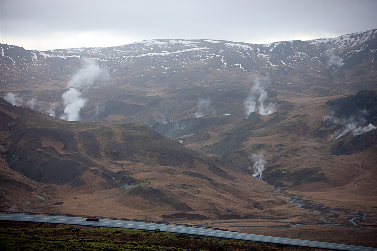 한시간 정도 내려가니 산골짜기에서 산불같은 연기가 모락모락 피어 오르는데 가만 보니까 수증기다. 화산지대라는 이야기다. 그래서 수증기없는 산에는 눈이 그대로 있는데 김이 모락모락한 곳에는 눈도 없고 푸른색이 보인다. 여기 지역이 전부 다 저렇게 김이 나오는게 아니고 조금 지나니 보통 산처럼 조용하게 앉아 있다.