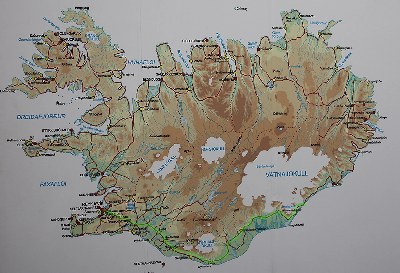 차 렌트한 첫날. 빙하지역 보려고 동남쪽으로 길을 잡았다. 하얀색 표시가 빙하지역 표시다. 그러니까 빙하가 북에서 남으로 이동하는 모양이다.