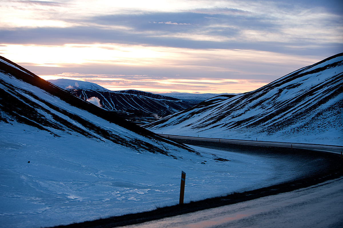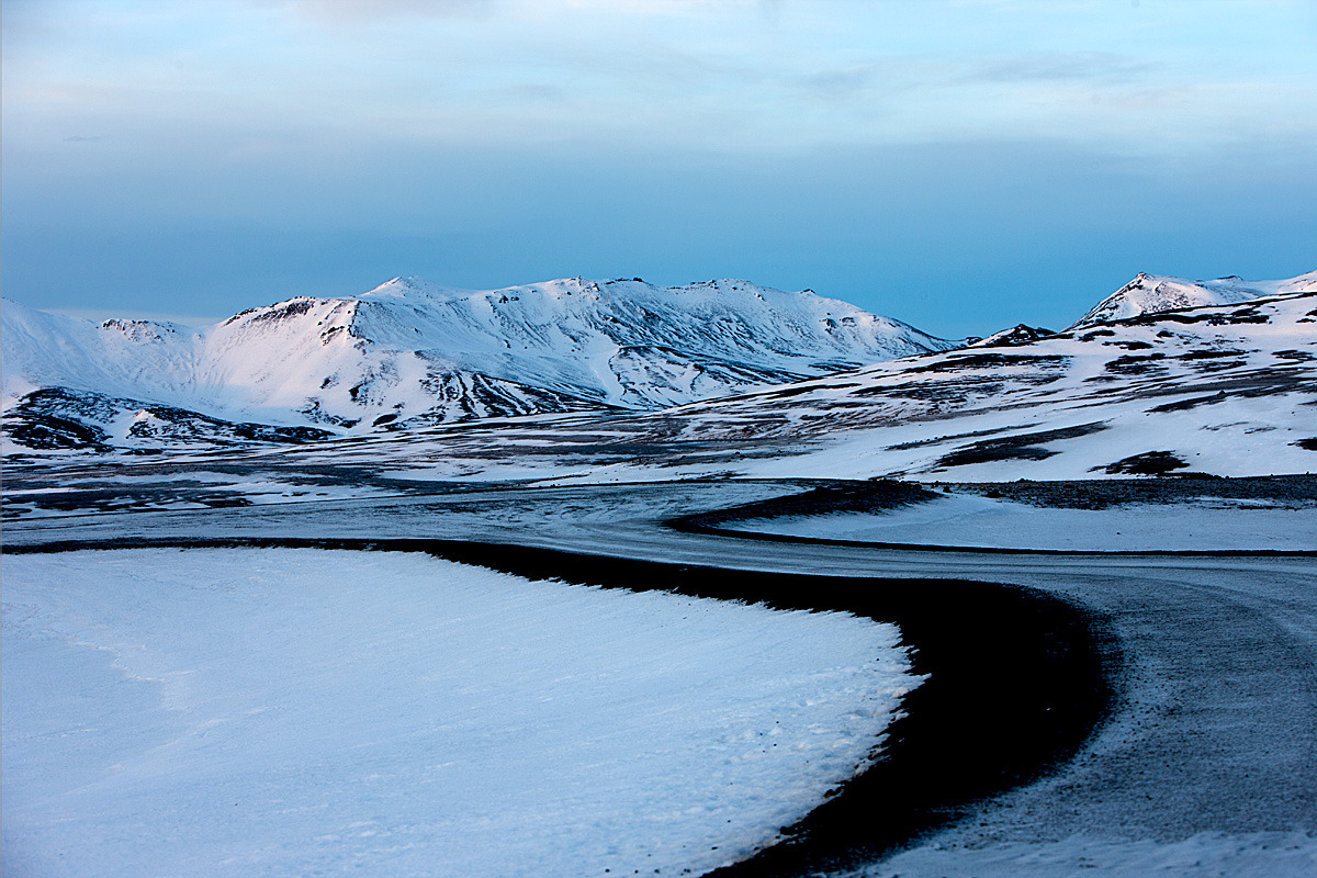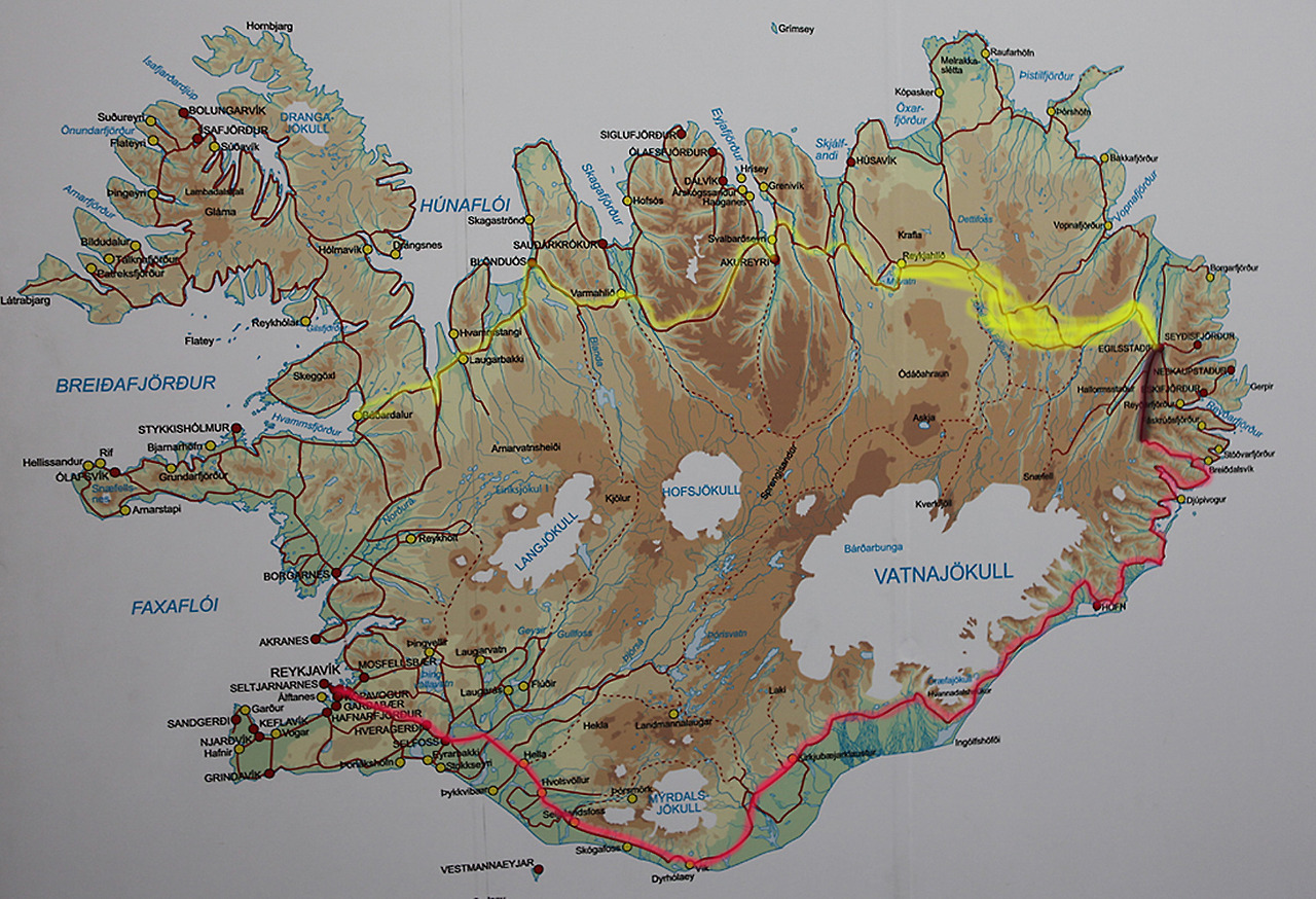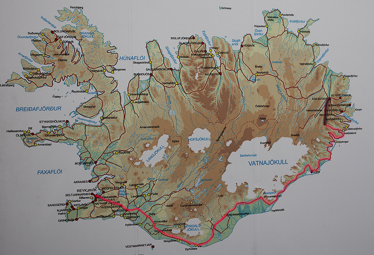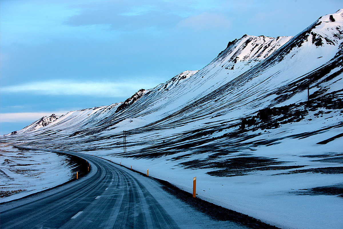 아침빵을 호텔에서 엄청 단단하게 먹고 둘째날 달린 길이 노란색인데 진하게 칠해논 지역이 아이슬랜드 겨울경치의 백미다. 처음에는 나혼자 그렇게 생각했는데 뉴욕갈 때 마침 옆에 앉은 현지인에게 물어 보니 내 생각이 맞단다. 설원과 설산의 아름다운 경치를 배터지게 먹고 눈터지게 담고 보니 어제 저녁 지옥에 다녀온 그 추억을 깡그리 잊어 버렸다. 인간이 그 지겨운 오랜 시간을 살수 있는 이유는 단한가지 신으로부터 부여받은 축복인 “망각” 때문이란다. 잊어버림이 새로운 삶으로 나아가는 지름길이라는데 때로는 잊어 버려야 할 것들을 청산하지 못해 평생 가슴않이로 살아가는 사람도 있다는데……… 그렇게 살지는 않아야 하는데. 지금부터 겨울 아이슬랜드 백미를 사진으로 보여 주는데 조금 지겹더라도 인내를 가지고 보도록 해라. 그리고, 왼쪽윗부분 노란색 칠한 지역이 여름 경치의 백미라 하는데 언제 시간되면 여름에도 한번 가 봐야겠다.