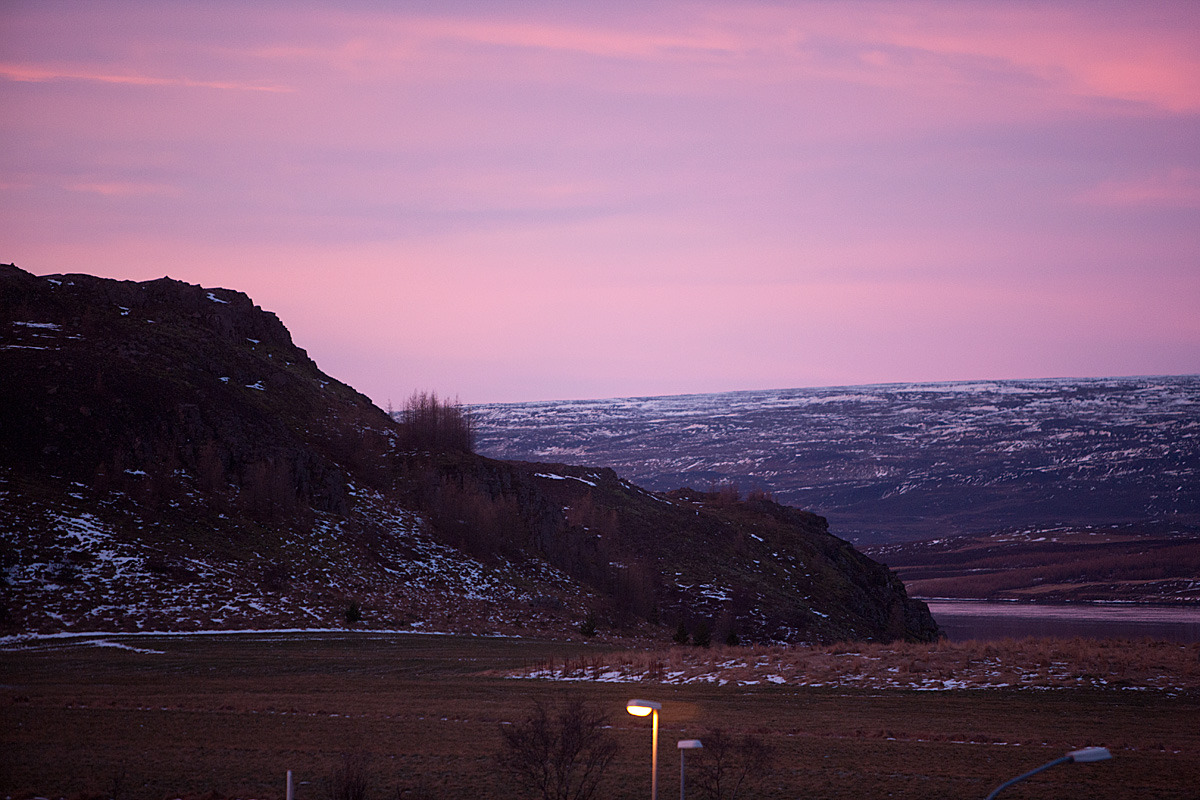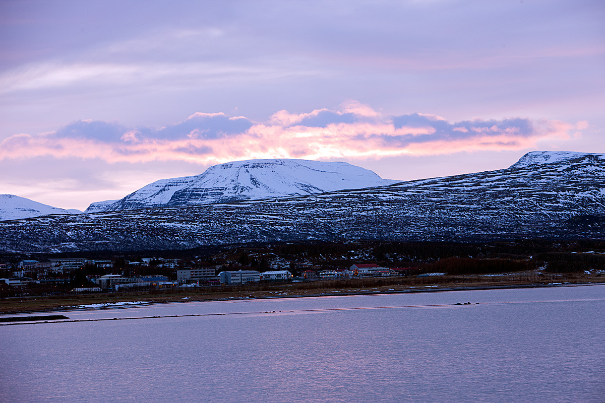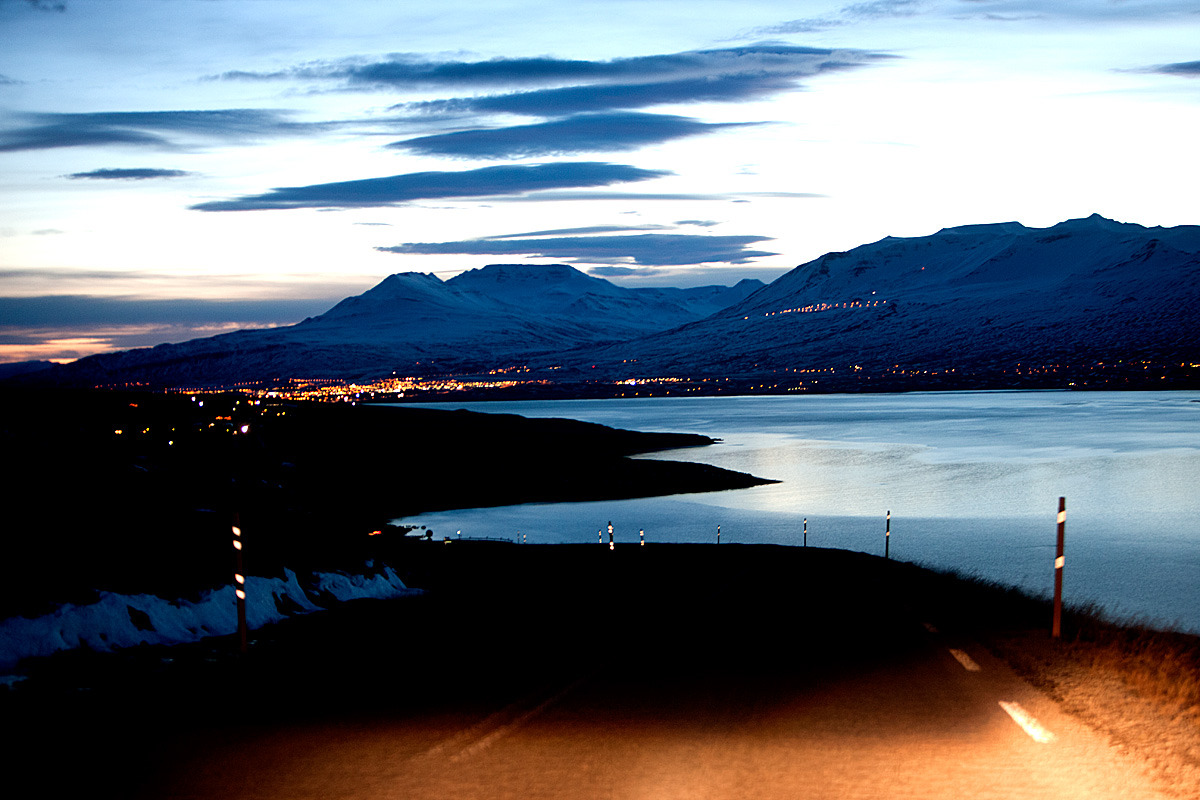 조금 더 달리니 아주 큰 도시가 물가에 있는데 밤야경이 산정호수에 비치는데 그것도 보기에는 일품이었다. 도시 이름이 AKUREYRI로 아이슬랜드 5대 도시에 드는 것 같다. 북부 해안가에 자리잡아 여름에는 주변 경치가 매우 뛰어 나다고 하는데 그것도 걍 다음으로 기약하고 여기서 하루를 접는다.-jh-