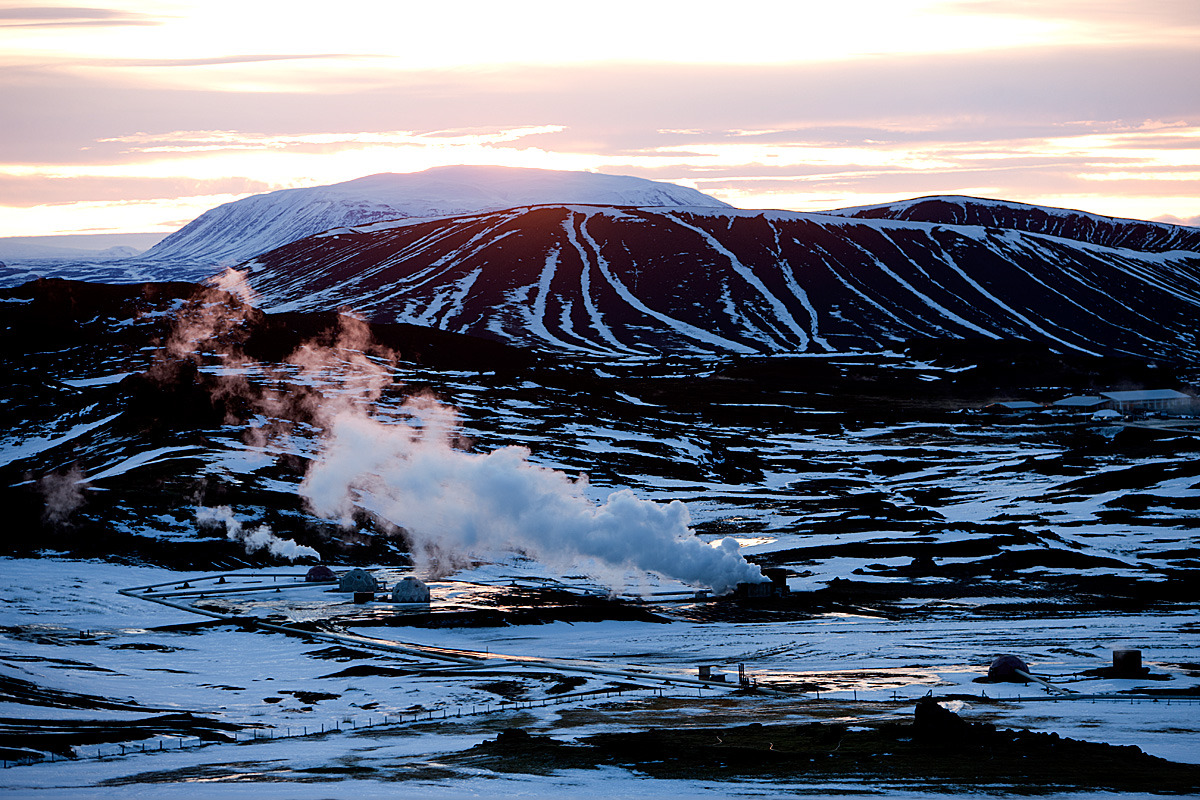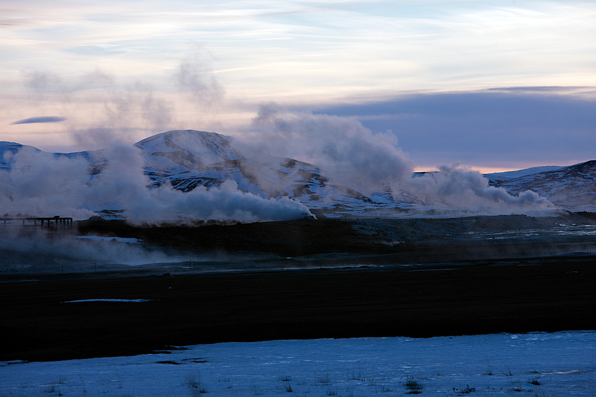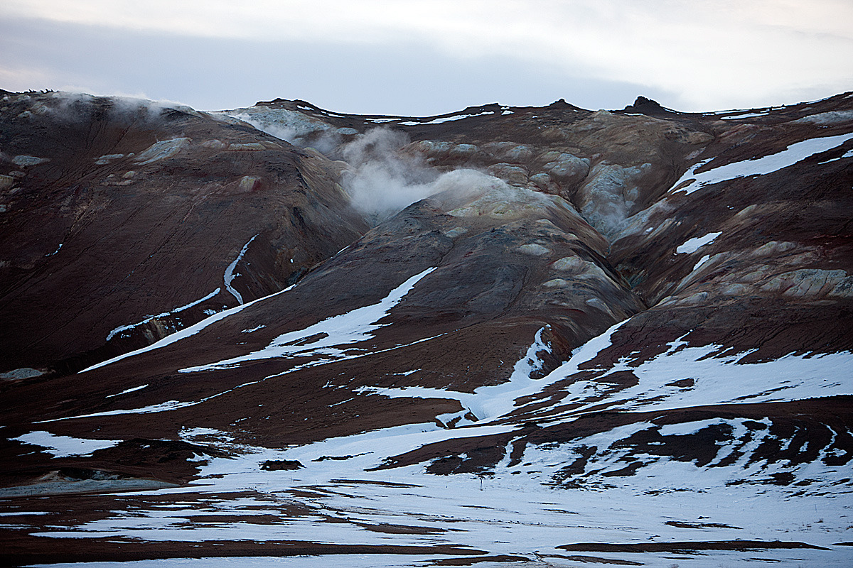 구릉 사이로 김이 모락거리는데 더운 수증기가 근처의 바위들 색상도 변해 버리는 것 같다.