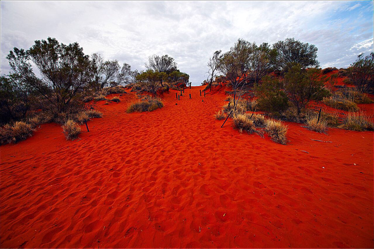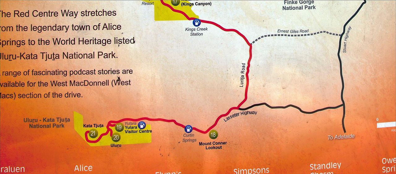 카타추타를 마지막으로 국립공원 관람을 마치고 들어 온 길을 다시 되돌아 나갔다. 남쪽으로 가기 위해서는 THE STUART HWY를 타야하기 때문에 위 지도에서처럼 LASSETER HWY로 나갔다. 어제밤에 그냥 지나쳐온 (18)번 MOUNT CONNER LOOKOUT에 들어갔다. (18)번 전망대로 올라 가는 길에 깔린 모래가 유난히 붉다. 저녁 노을시간이기에 조금은 더 붉게 보일 수는 있겠지만 모래의 붉음이 THE RED CENTER의 심볼인 것 같다.