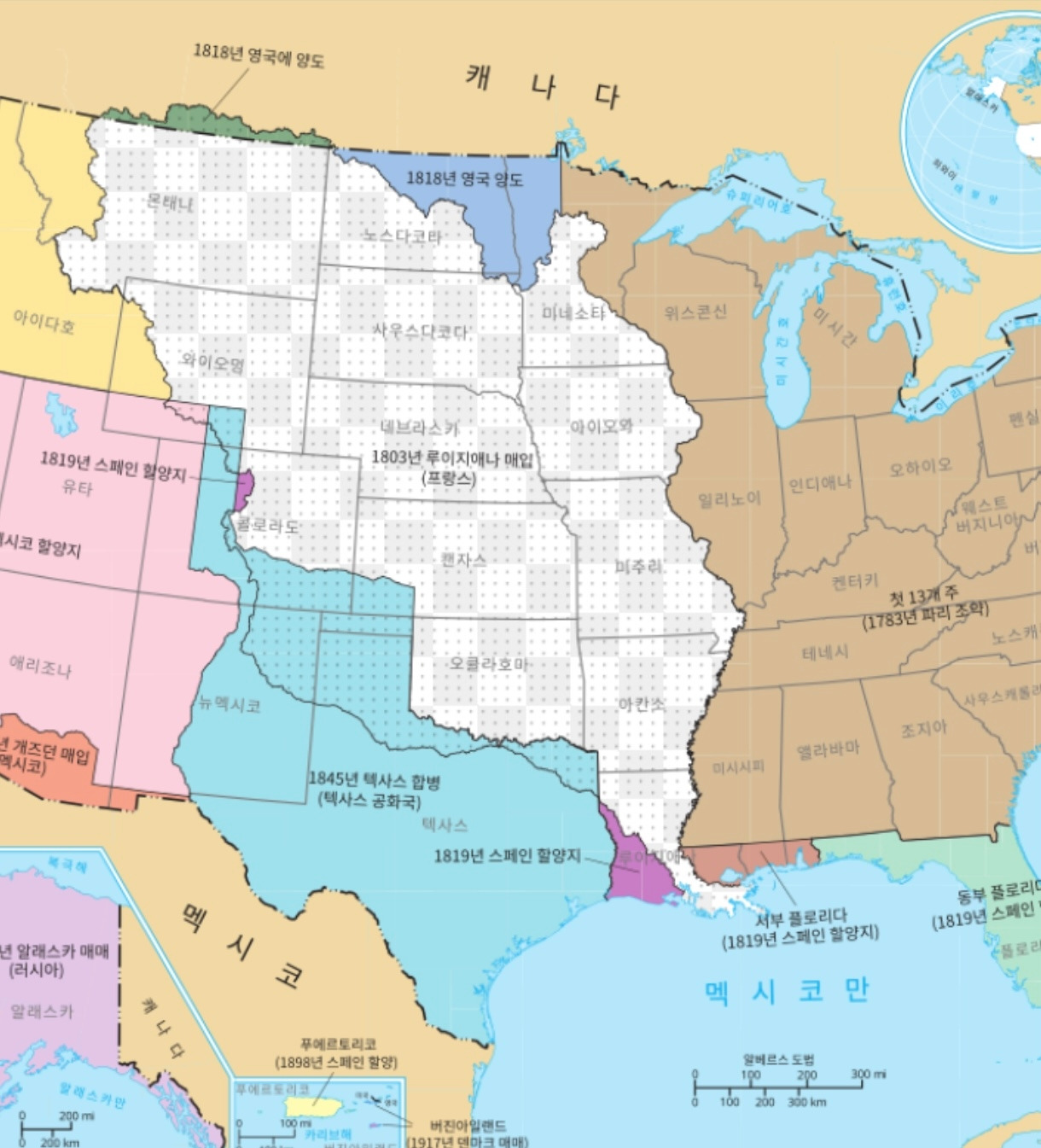 미국이 프랑스로부터 사들인 루이지애나가 현재 미국의 남부에 있는 조그마한 루이지애나 주가 아니고 미 중서부를 커버하는 광대한 영토임을 위 지도를 보면 확연해진다.