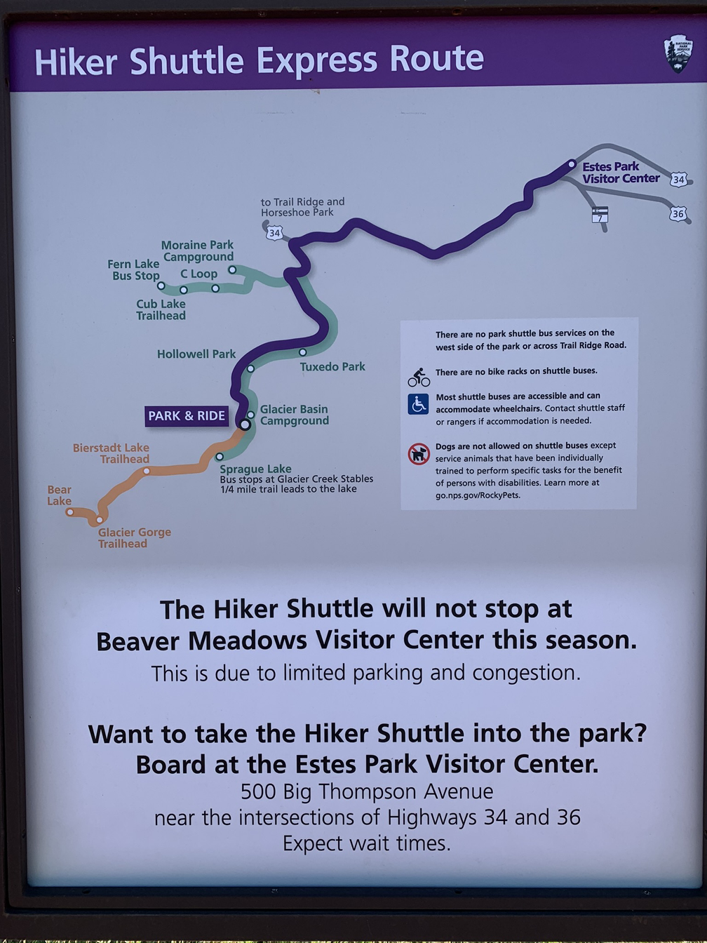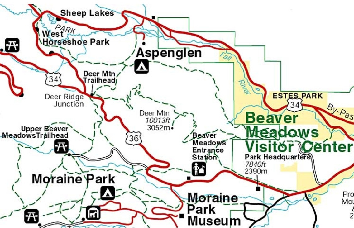동부에서 공원으로 들어오는 경우 맨 처음 만나는 Visitor Center가 위에서 언급한 Estes Visitor Center이고 이것 외에 Visitor Center가 두 개 더 있다. Estes Visitor Center를 나와 계속 공원 쪽으로 진입하면 Estes Park 지점에서 길이 두 갈래로 나눠진다. 계속 직직하면 하늘로 올라가는 길인 Trail Ridge Road를 타게 되고 그러면 곧 Fall River Visitor Center를 만나게 되고, Estes Park에서 좌회전하면 36번 westbound를 타게 되어 곧 Beaver Meadows Visitor Center를 만나게 된다. 어디로 가던 Visitor Center를 만나지만 가급적 Beaver Meadows Center로 가는 게 좋은 게 Beaver Meadows 센터가 공원 내 본부(Headquarter)이므로 전시물이나 볼거리가 다른 센터보다 훨씬 풍부하게 전시되어 있기 때문이다.