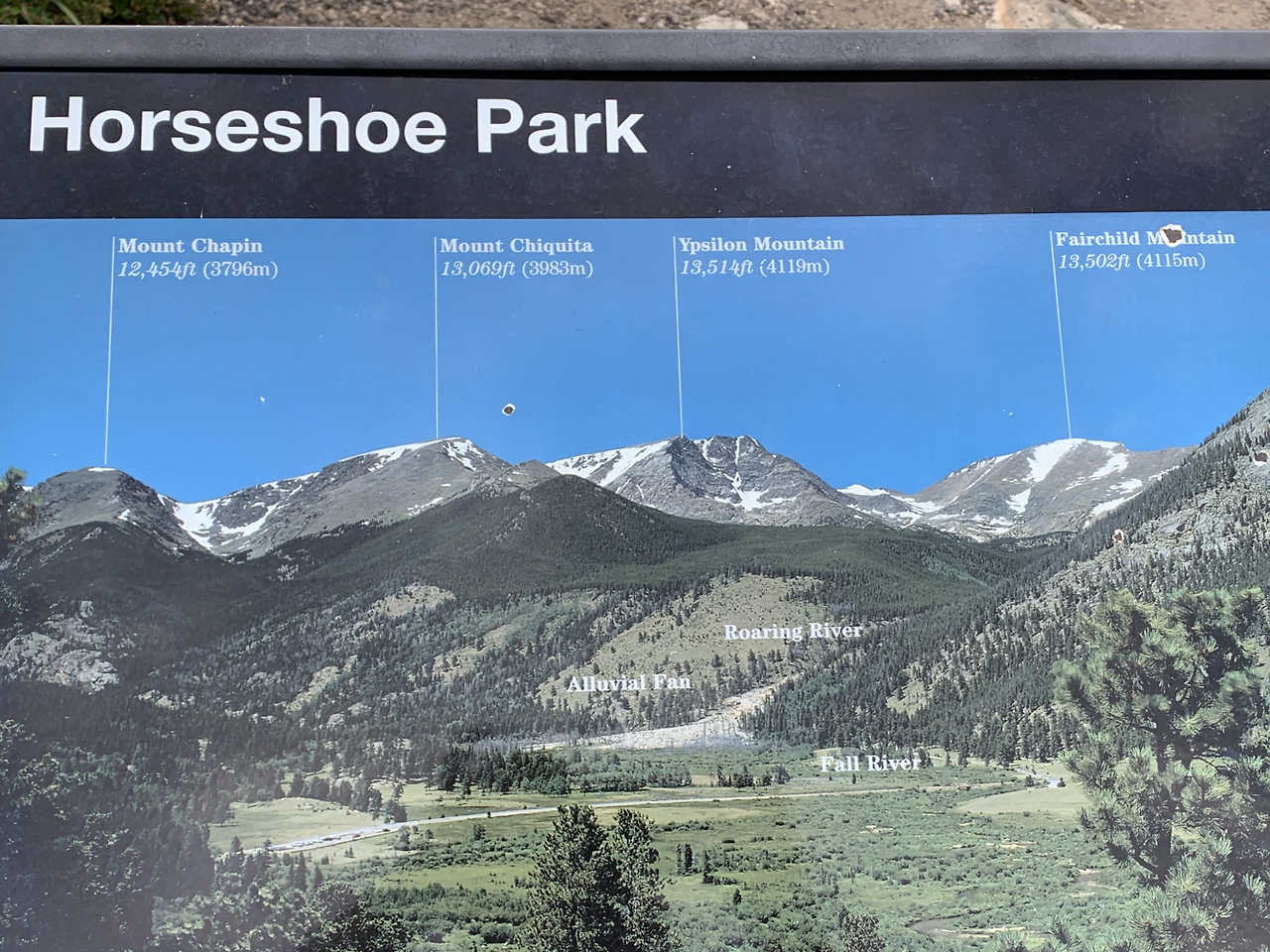Horseshoe Park에서 같은 자리에 서서 고산들을 촬영했다. 산들의 윤곽이 입간판의 그것들과 일치했다. 오른쪽부터 나열하면 Fairchild 산, Ypsilon 산, Chiquita 산 그리고 Chapin 산 순서다.