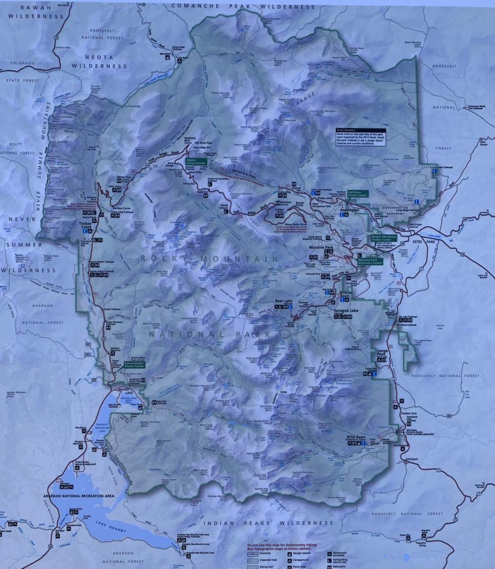 록키산 국립공원 지도. 동부에서 들어오는 방문객은 고속도로 70번 west를 타고 오다 덴버(Denver)를 거쳐 34번 west 간선을 타고 공원으로 진입하게 되고, 서부에서 들어오는 방문객은 서부지역은 록키산맥과 연결되는 산악지대로 길이 하나밖에 없어 불편하다. 고속도로 70번 east를 타고 오다 간선도로 40번을 만나 north로 올라오다 Granby라는 곳에서 34번 간선을 만나 east로 올라오다 Grand Lake에서 비로소 공원으로 진입하게 된다.