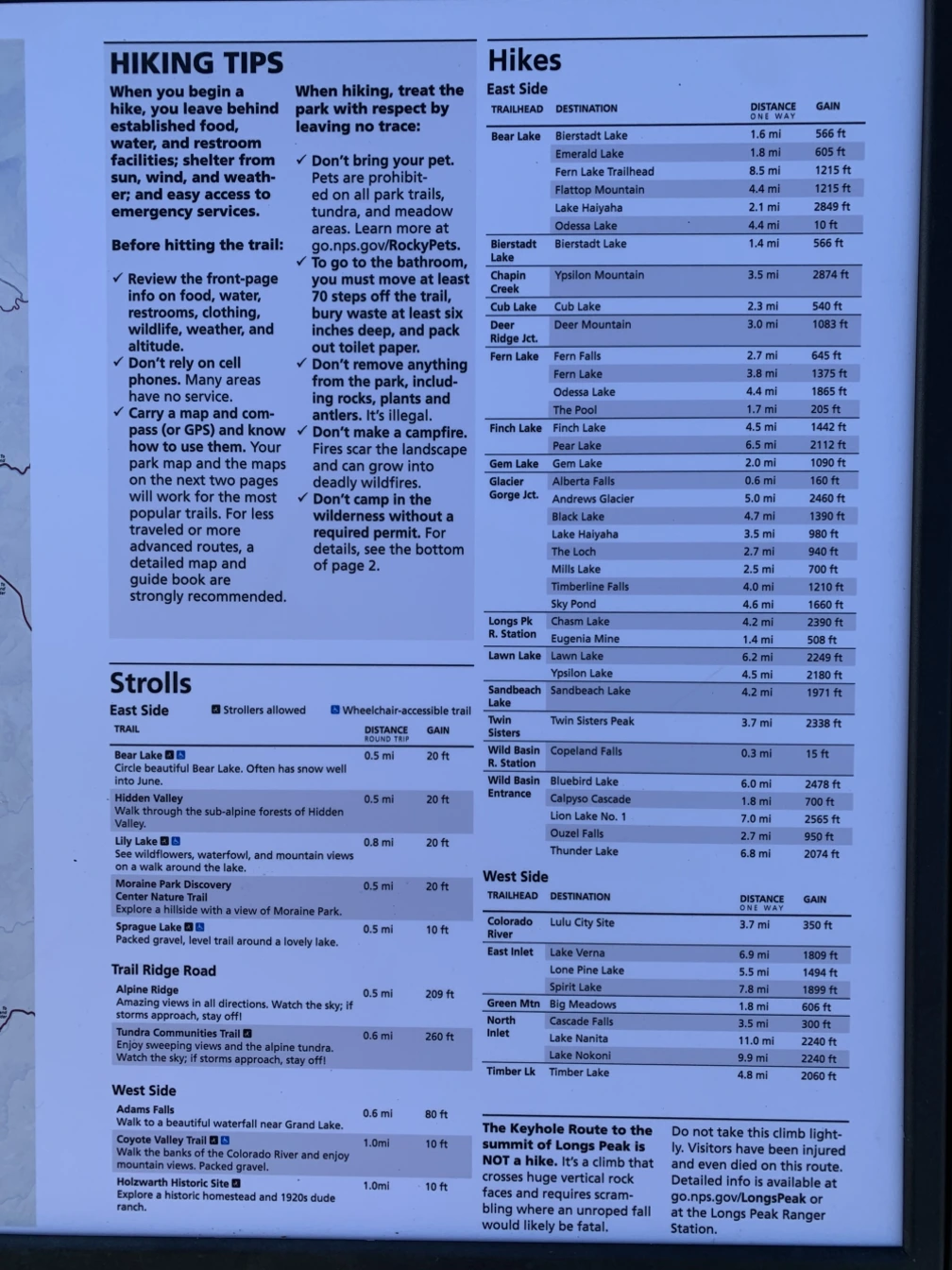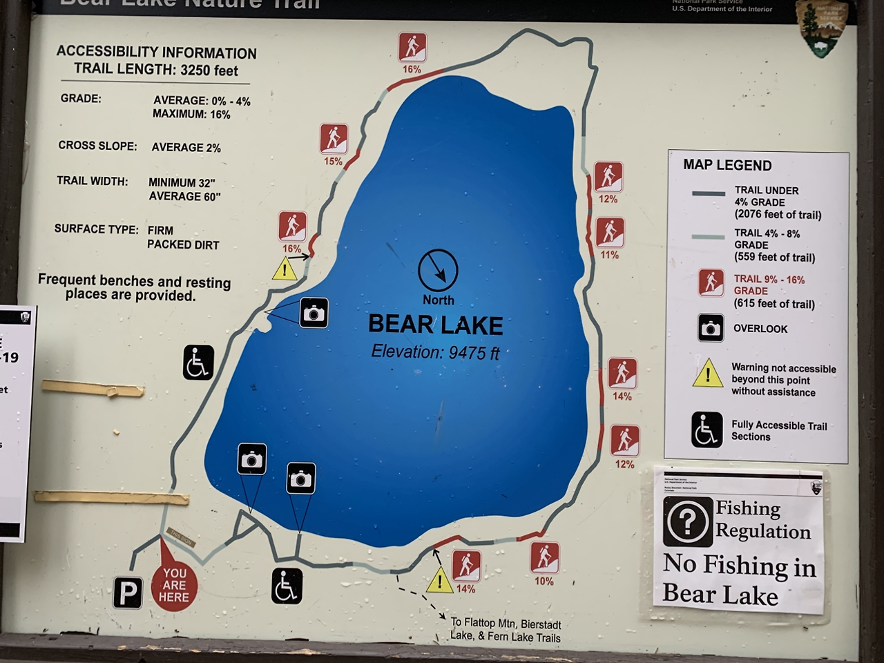 애완견은 데리고 갈 수 없고, 트레킹 중 화장실 가야 할 경우 세부적으로 지침을 주고 있다. 트레일에서 최소 70보 이상 떨어진 곳에서 볼일을 보고, 배설물은 최소한 6인치(15cm) 깊이로 파서 묻어야 한다. 공원 내 어떤 자연물은 채취할 수 없고, 캠프 파이어도 금지하며 허가증 없이는 야영을 금지하고 있다. 이 일람표를 보면 거리가 1마일(1.6km) 이하인 트레일과 1마일 이상인 트레일을 차별하여 부르는데 후자를 Hiking이라고 하고 전자를 산보(stroll)라고 한다. 방문객들이 가장 많이 가는 Bear Lake 트레일은 편도 0.5마일로 산보 수준에 든다.