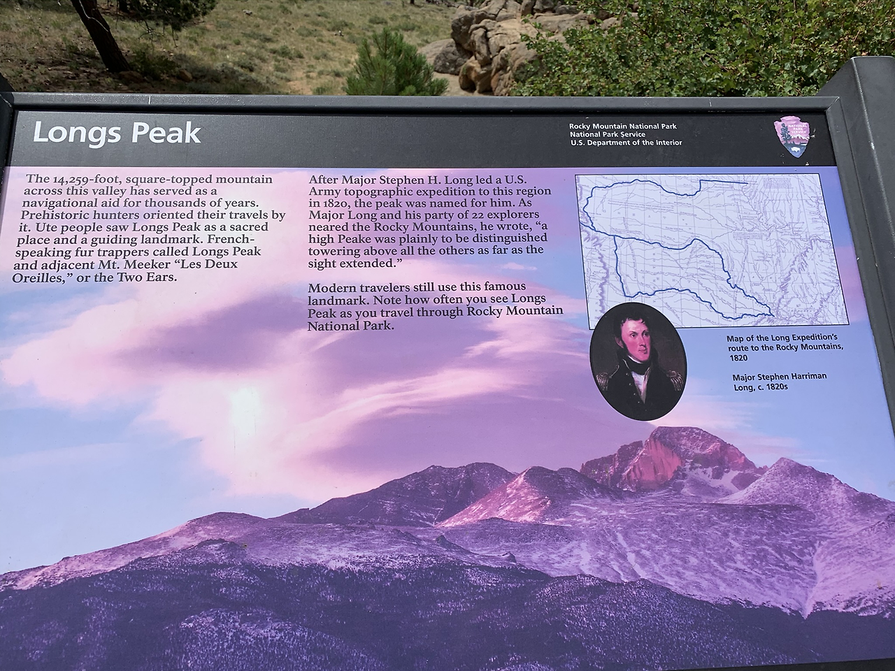 1820년 미육군 Stephen H. Long 소령이 22명의 지형 탐험대를 인솔하여 이 지역을 둘러보고 말하기를 <이 산은 그 높이가 주변 것들보다 월등하게 높아 눈에 쏙 들어온다> 그 후부터 소령의 성을 빌려 Longs Peak이라고 하였다. 지금도 산악인들은 Longs Peak을 길라잡이로 활용하고 있다고 한다.