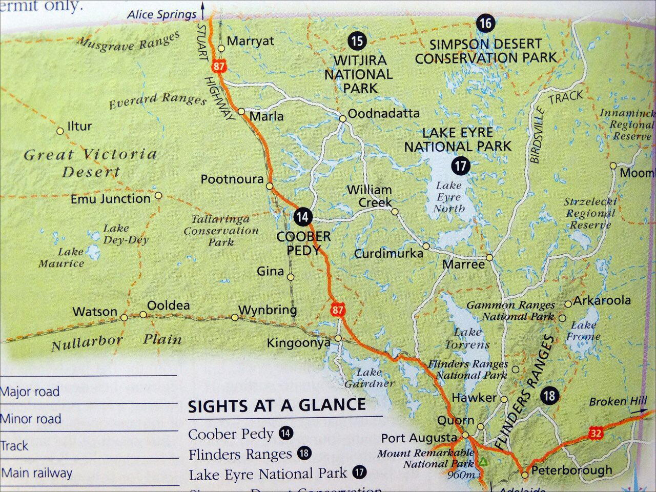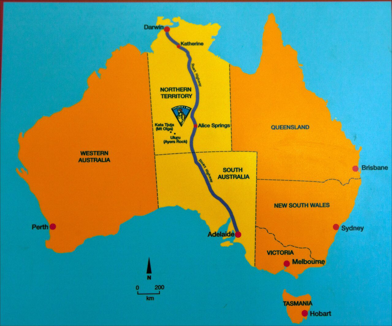 THE STUART HWY를 만나 계속 남쪽으로 내려오면 남호주주를 만나게 된다. 주도는 ADELAIDE로 왼편으로는 서호주주를, 오른쪽으로는 NEW SOUTH WALES를, 오른쪽 밑으로는 VICTORIA주를, 오른쪽 위코너로는 QUEENSLAND를 접하고 있어 본토중에서 유일하게 모든 주를 접하고 있다. 위 사진이 남호주주의 위치를 잘 보여주는 지도로 주도 ADELAIDE에서 DARWIN까지 호주 남북을 관통하는