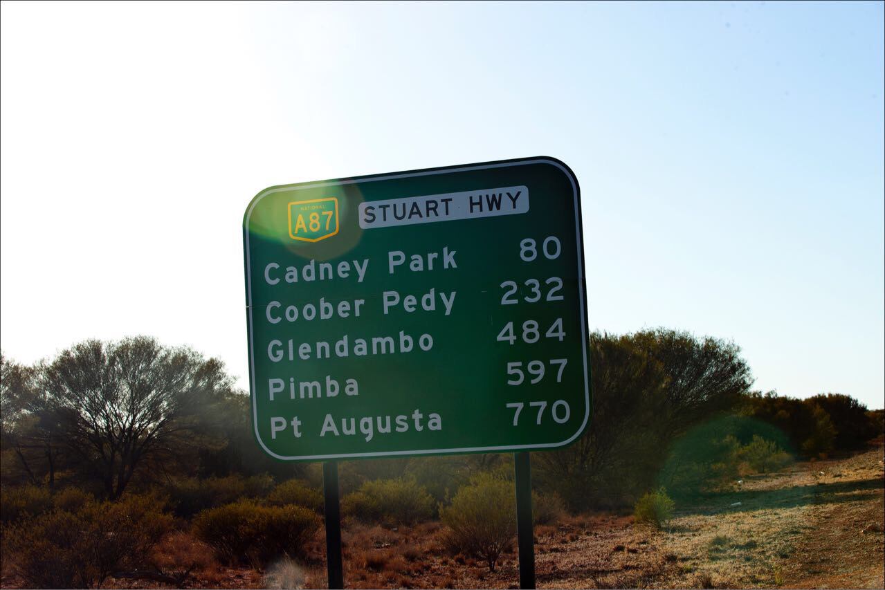 STUART HWY를 잘 보여주고 있다. 운전해 가면서 남호주주 MARLA 라는 마을에서 찍은 이정표를 보니 오늘 둘러보고 갈 도시 COOBER PEDY는 아직도 232KM를 더 가야 한다. 역으로 계산해보니 어제 저녁 MOUNT CONNER 전망대에서 출발하여 번갈아 가면서 운전해 온 거리가 430KM 로 밤사이에 서울-부산을 달려 온 셈이다.