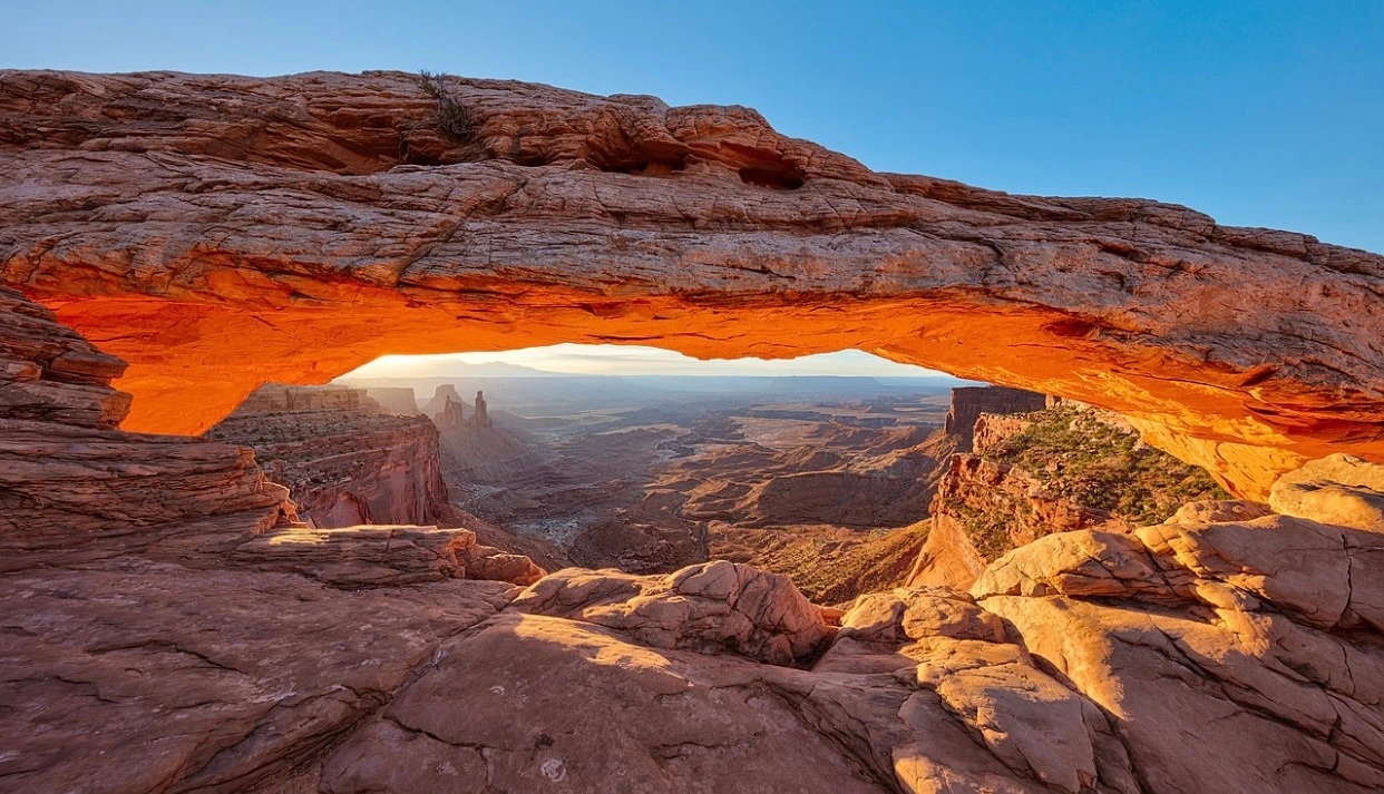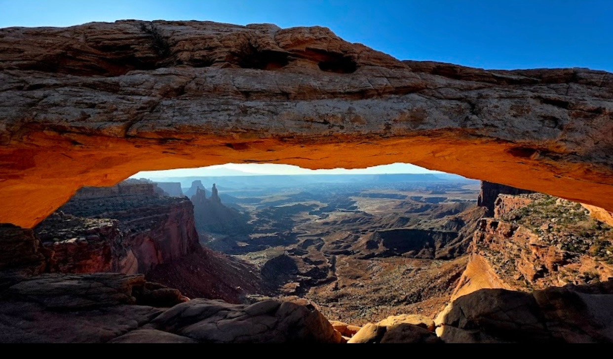 위 지도에서 위치를 찾아보면 Visitor Center에서 아래로 내려가는 길에서 Upheaval Dome으로 올라가는 길 교차로에 있다. 옆에는 Aztec Butte도 있고 밑에는 Green River 전망대도 있다. Mesa Arch 트레일은 완만하여 어린이도 동반할 수 있고 왕복 0.5 mi (0.8 km)로 쉽게 갔다 올 수 있는 트레일이다. 일출 사진 포인트로 유명하다.