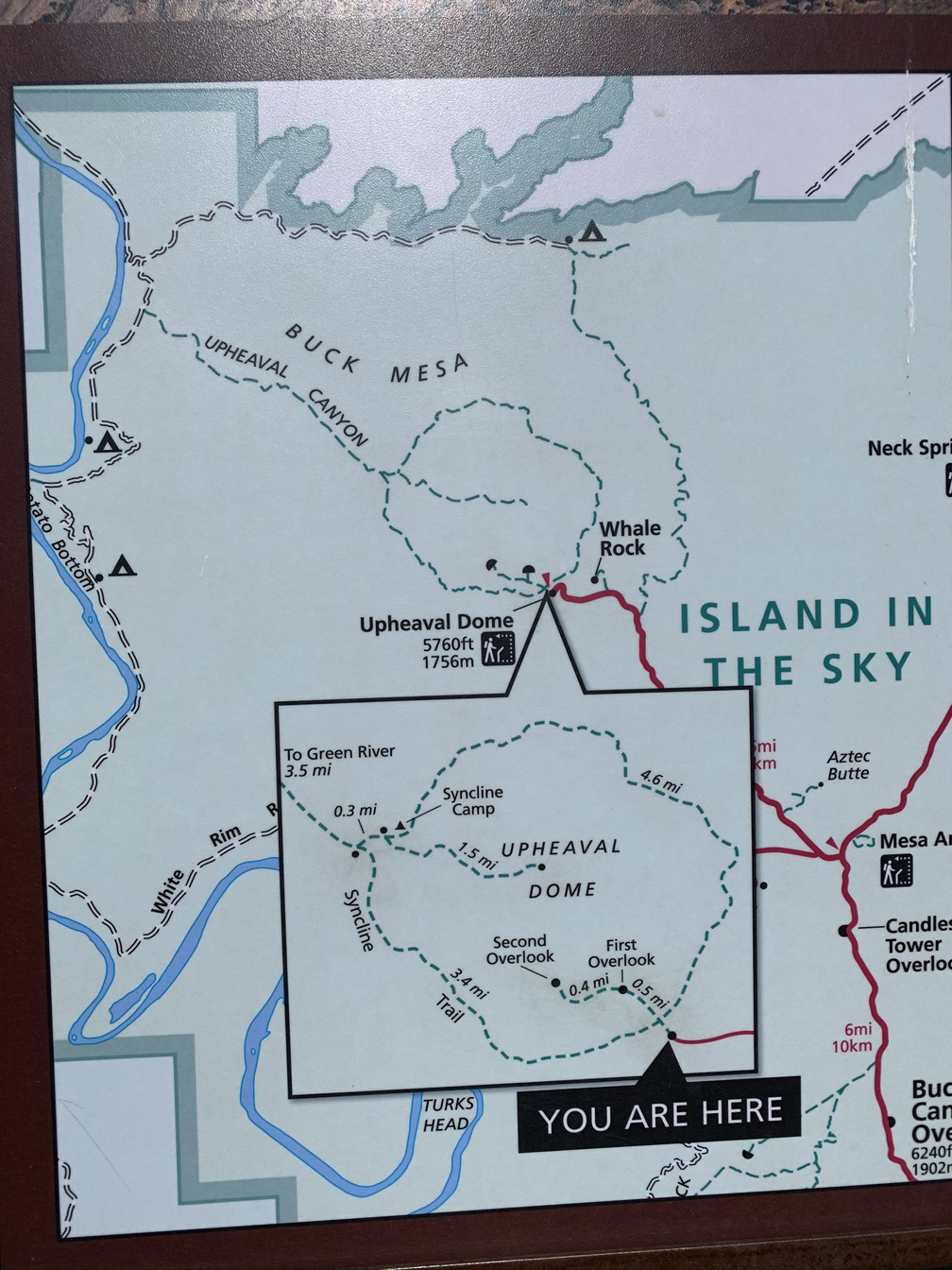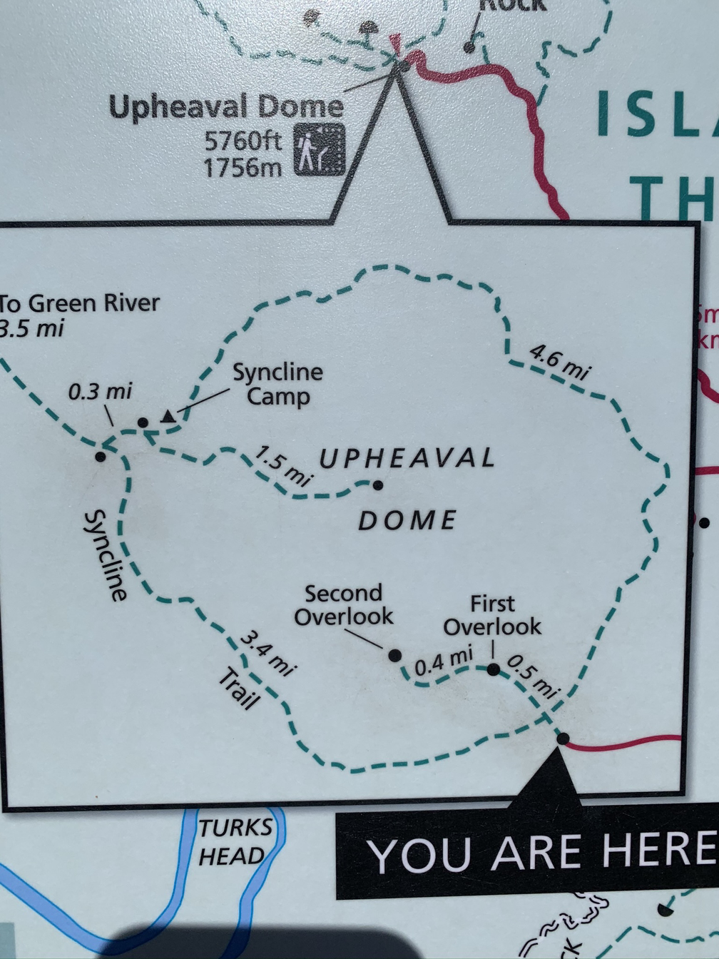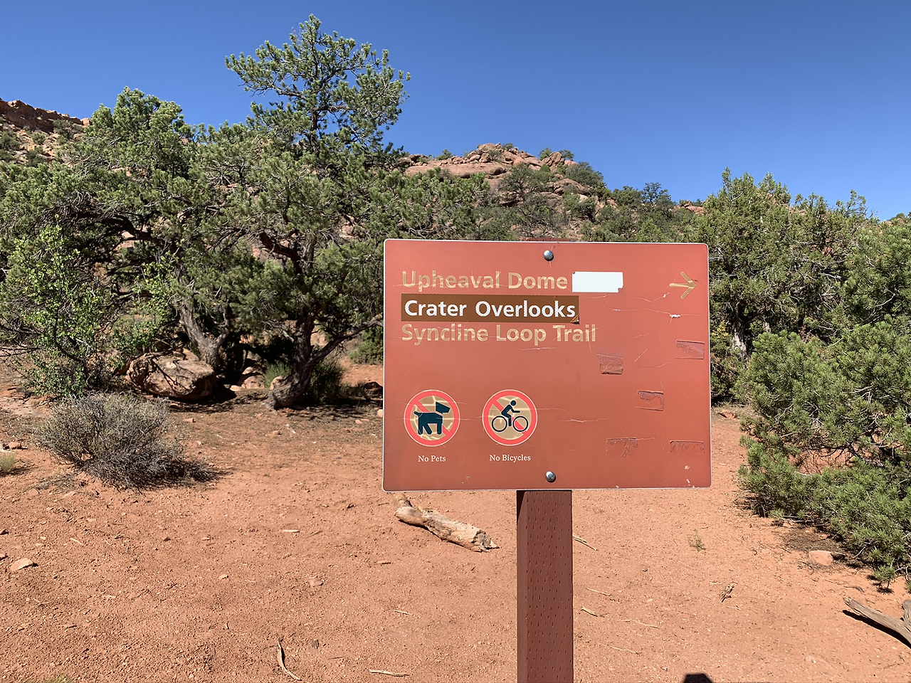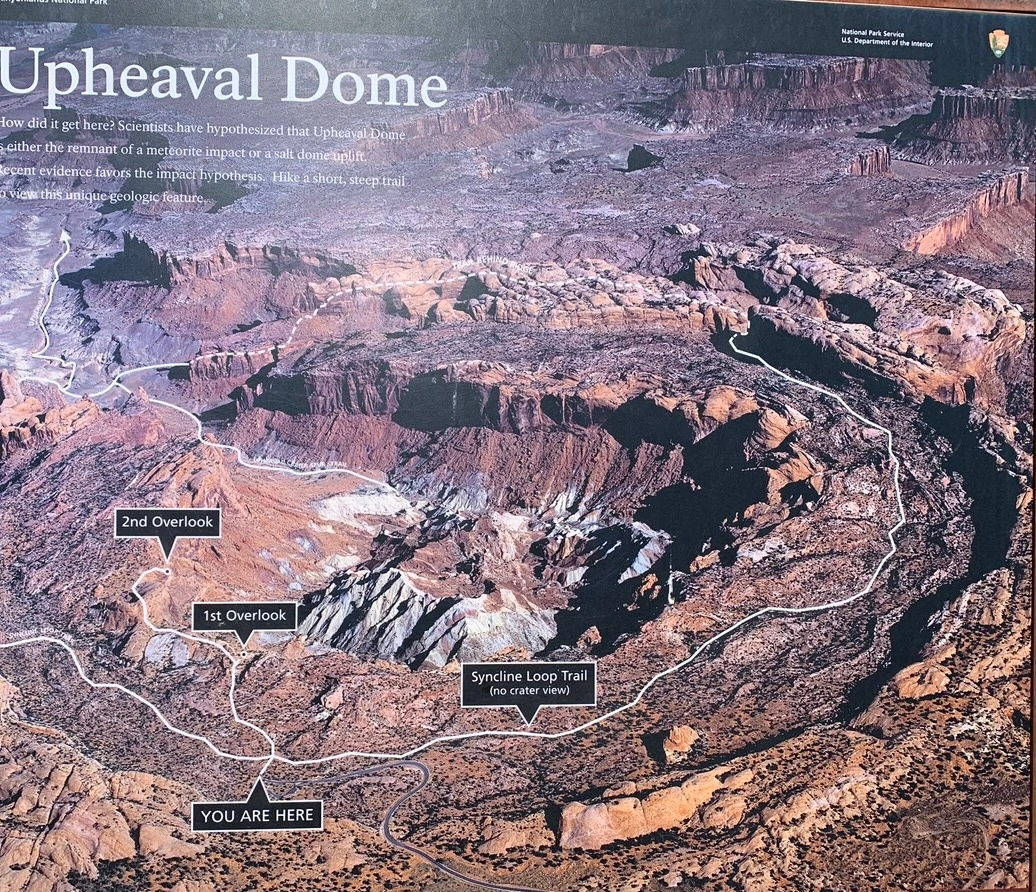 Upheaval Dome을 한 바퀴 도는 트레일이 있는데 총길이 8.3마일(13.3km)의 Syncline Loop Trail이 있다. 이 트레일에서 0.5마일 가면 제1 전망대가 있고, 그곳에서 0.4마일 더 가면 제2 전망대가 있다. 마음 같아서는 분화구 주변을 한 바퀴 돌고 싶었지만 시간상 무리일 것 같아서 제2 전망대까지만 가 보기로 하였다.