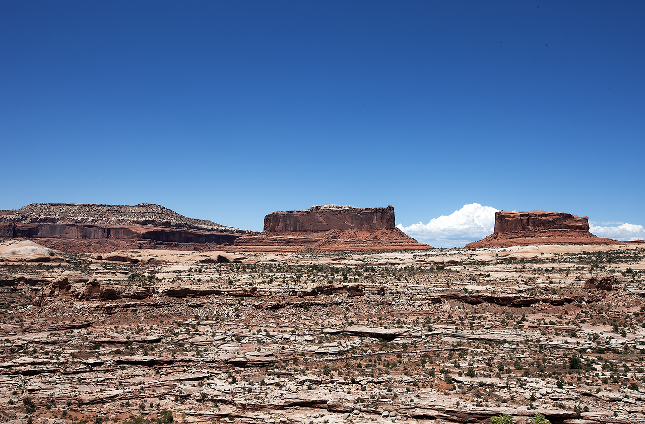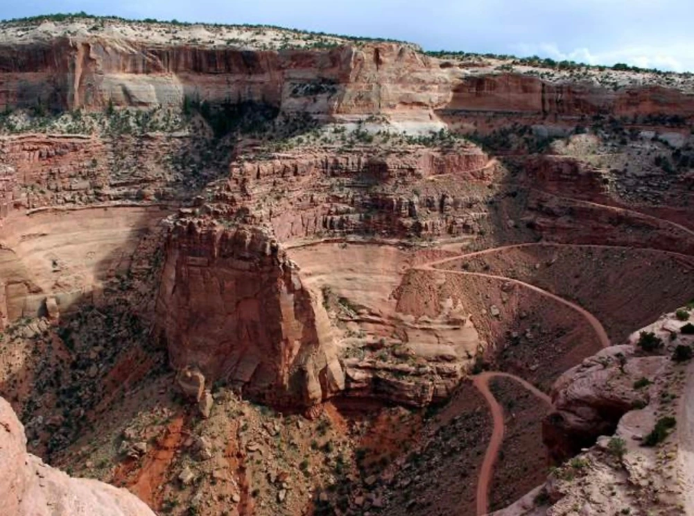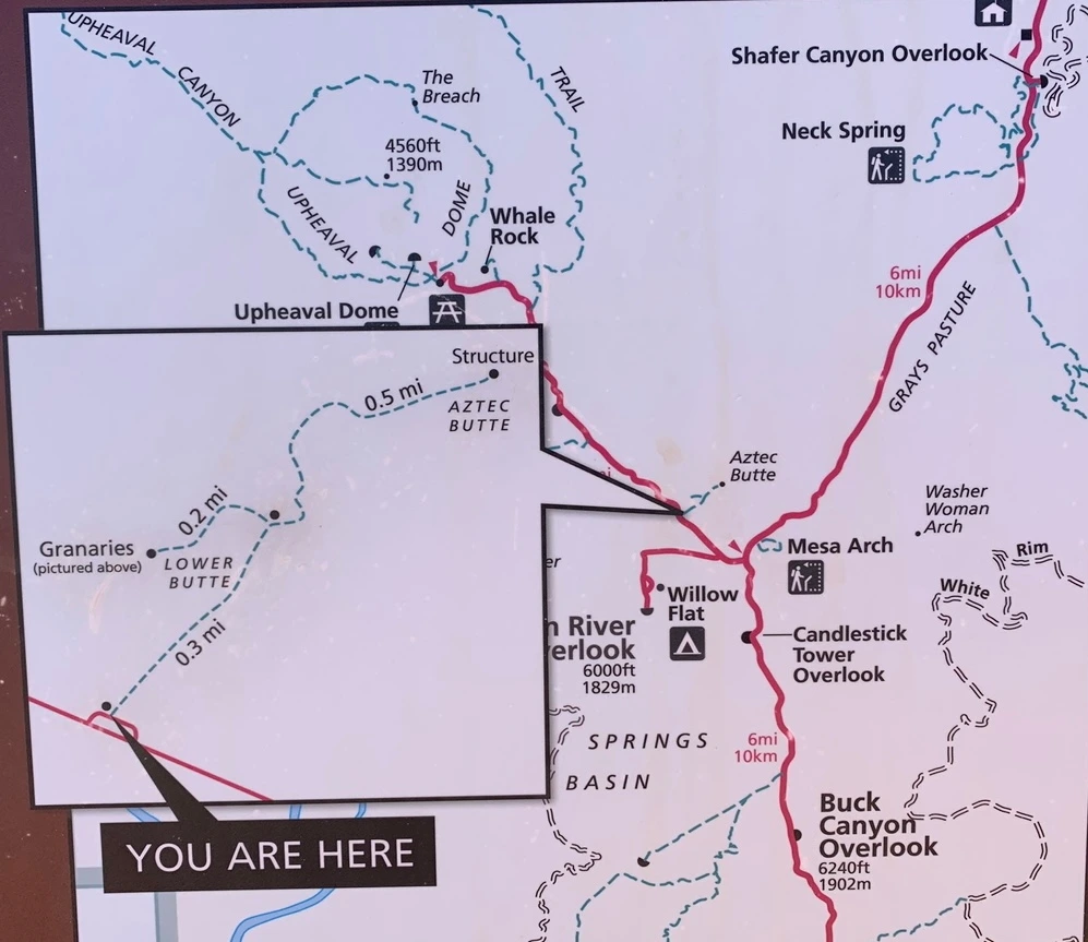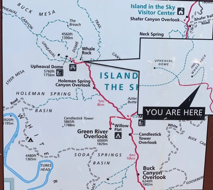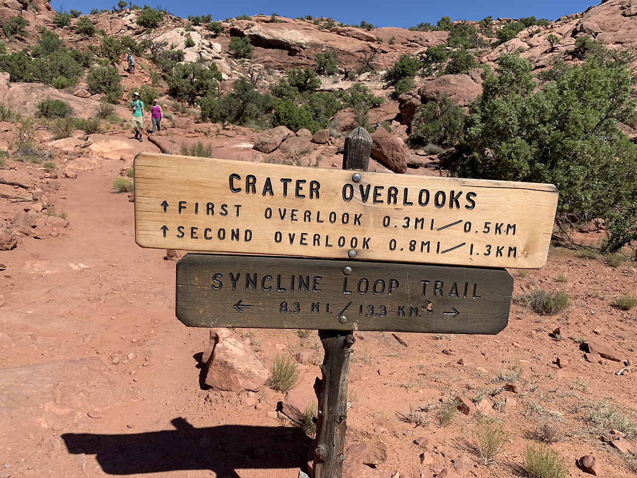 Upheaval Dome을 한 바퀴 도는 트레일이 있는데 총길이 8.3마일(13.3km)의 Syncline Loop Trail이 있다. 이 트레일에서 0.5마일 가면 제1 전망대가 있고, 그곳에서 0.4마일 더 가면 제2 전망대가 있다. 마음 같아서는 분화구 주변을 한 바퀴 돌고 싶었지만 시간상 무리일 것 같아서 제2 전망대까지만 가 보기로 하였다.