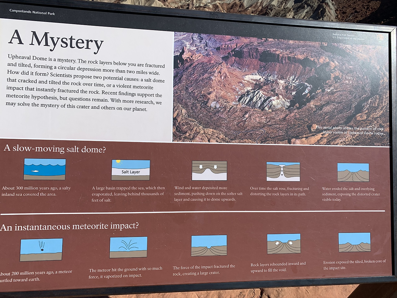 Upheaval Dome의 생성 원인에 대하여 아직까지 과학적으로 증명된 가설은 없다. 그래서 미스터리하다고 하는데 여러 가설 중에서 두 가지 가설이 유력하다.