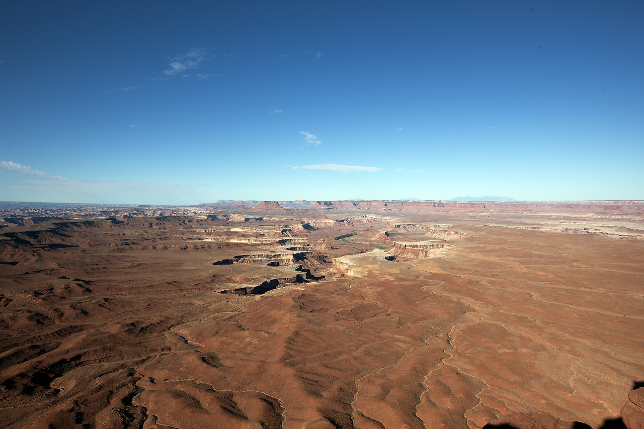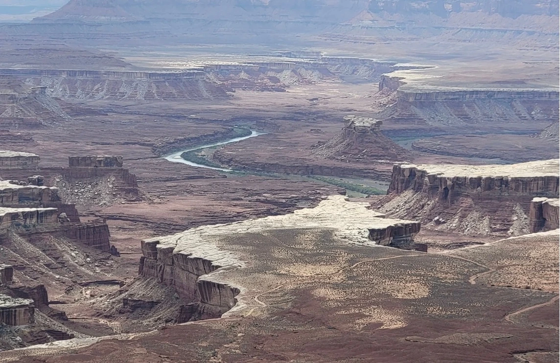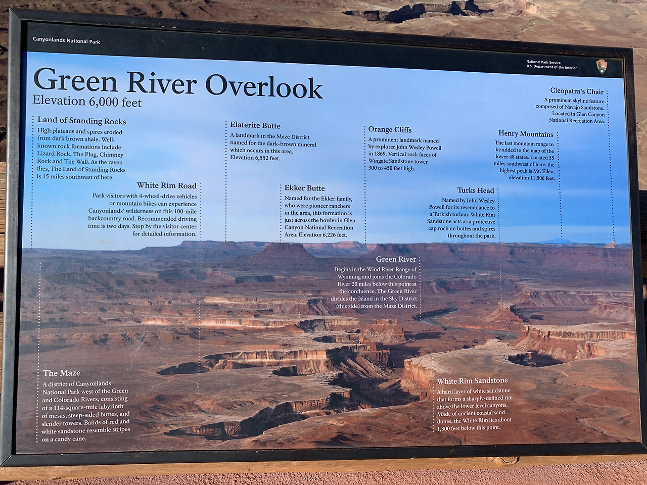 Green River 전망대에서 보면 푸른 Green River가 한눈에 보인다. 와이오밍주에서 발원한 Wind River가 흘려내려 유타주 캐넌랜드 국공에서 Green River를 만난다. 이강물은 아래로 20마일 더 내려가서 공원 동부를 따라 흘러내리는 콜로라도 강과 만나 the Maze 구역으로 흐르면서 Island in the Sky와 the Maze 구역 경계를 이루게 된다.