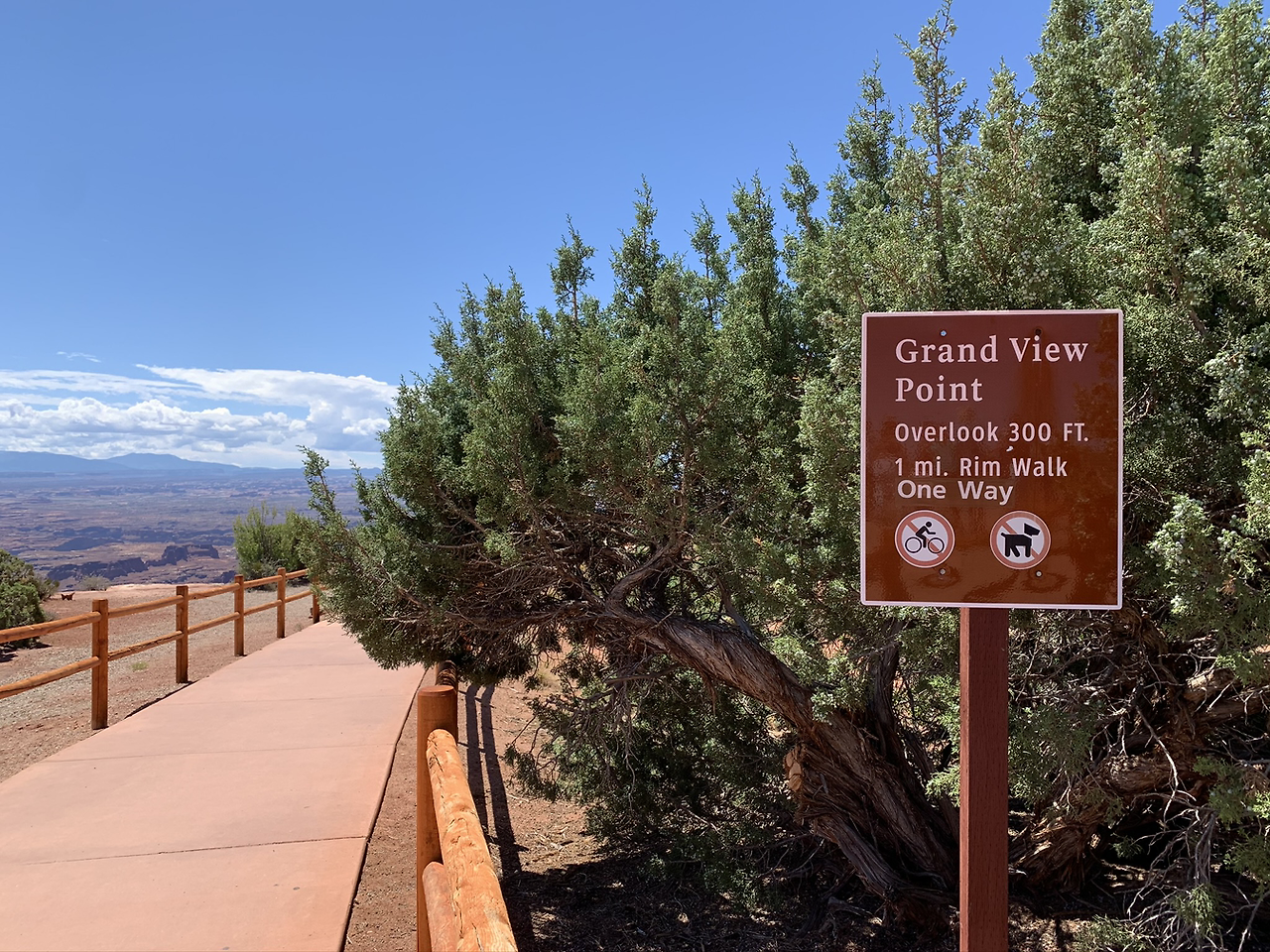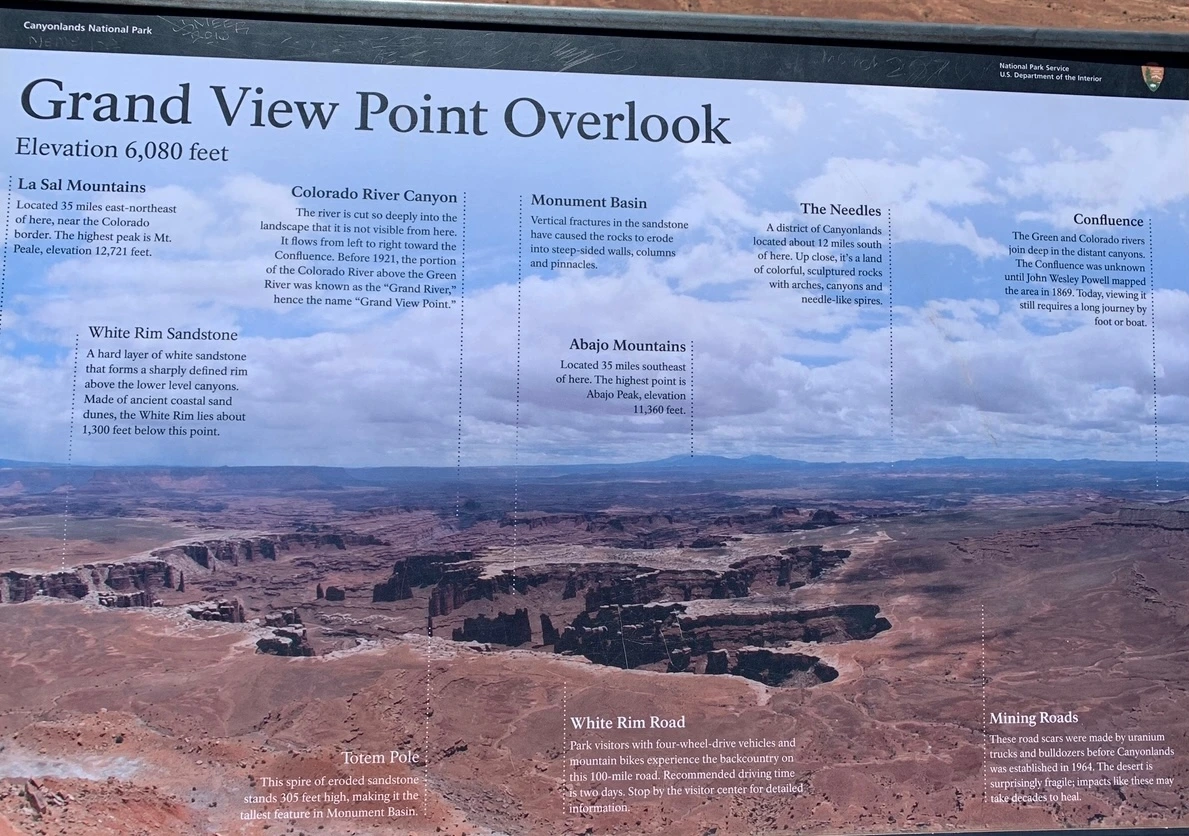 Grand View Point는 the Island in the Sky 구역의 최남단에 자리 잡고 있다. View Point에서 내려다보면 장구한 세월 동안 강물로 깊게 파인 협곡을 볼 수 있다. 여기가 the Island in the Sky 구역의 최남단으로 더 이상 내려가는길이 없어 the Maze나 the Needles 구역으로 넘어갈 수없다. 봄부터 가을시즌까지는 공원 Ranger가 공원의 지질학적인 특성을 설명하는 가이드 투어가 있다고 한다.