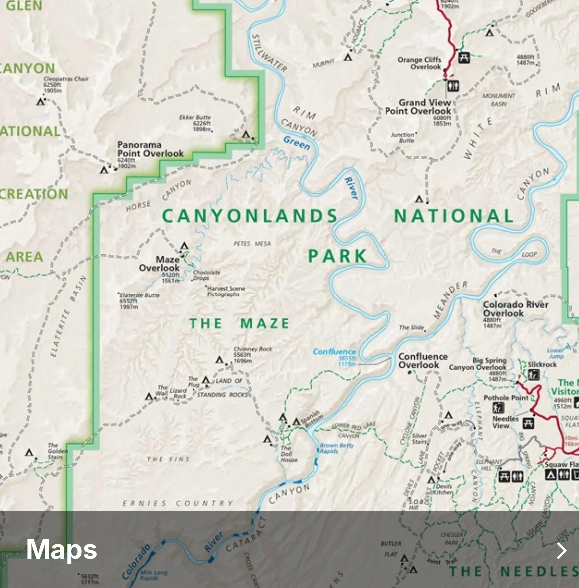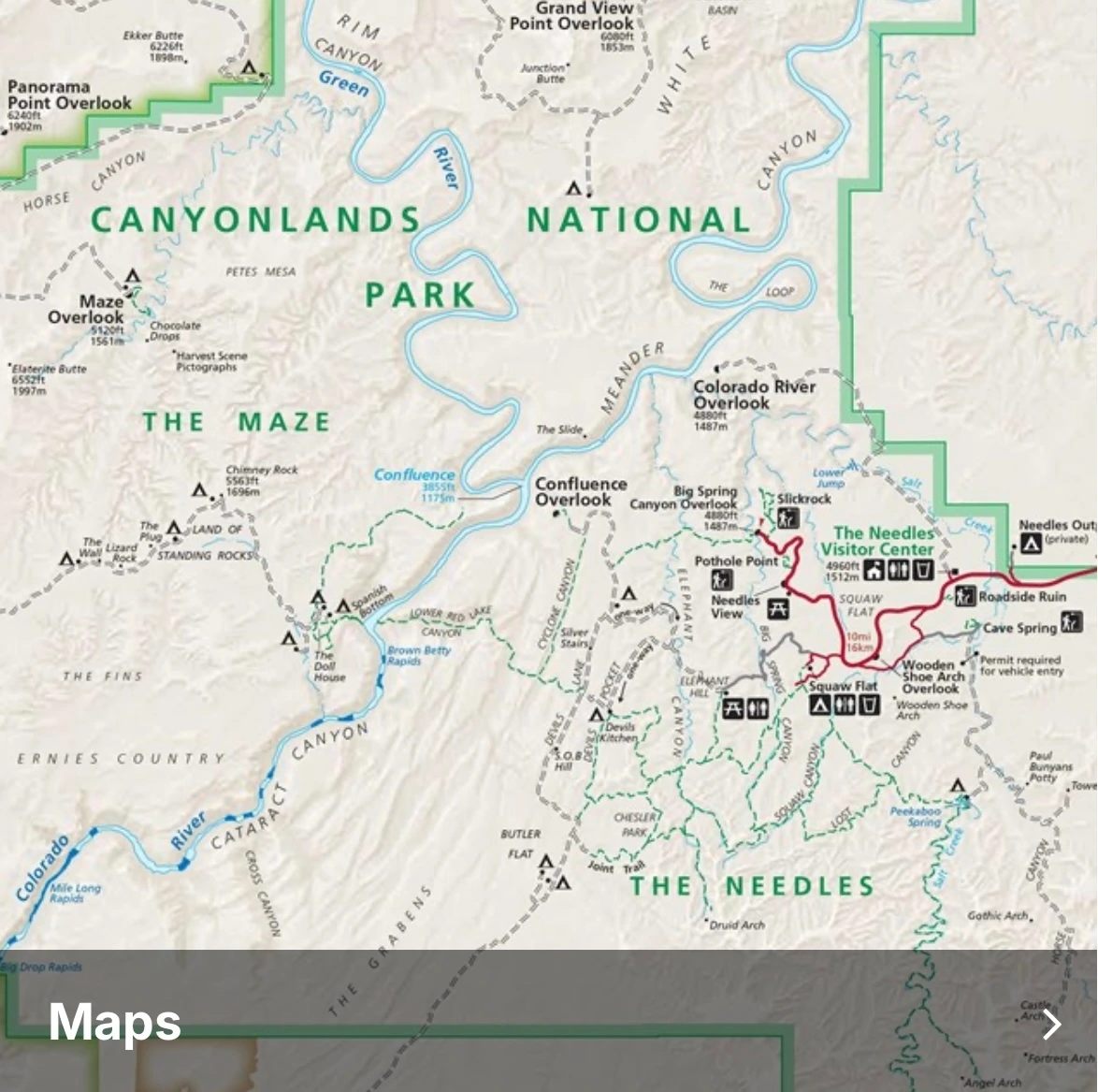 사진 오른쪽 위에 Confluence라고 설명되어 있다. 콘플루언스는 두 강물이 만나는 합류점을 의미하는데 공원의 동부 가장자리를 따라 흐르는 콜로라도강과 공원의 서부를 흐르는 그린 리버가 만나는 지점이다. 길이 없어 가기가매우 힘든 곳으로 장거리 길을 걸어서 가거나 아니면 강에서 보트를 타고 가야만 한다.