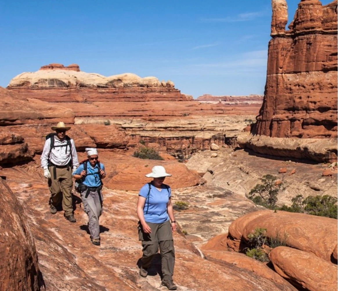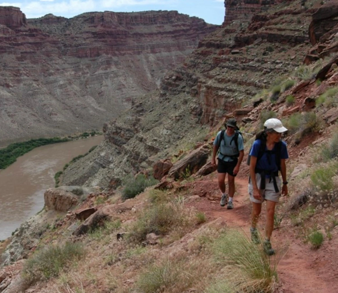 the Maze 구역 내 트레일을 걷는 트레커들. 왼쪽에 흐르는 강이 이 공원의 서쪽으로 흐르는 Green River이다.