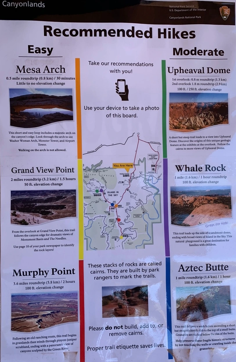 the Island in the Sky 구역에서 볼만한 곳을 정리한 입간판을 보고 그것 위주로 발품을 팔았다. 이번에는 다른 방문객들처럼 the Maze와 the Needles 구역은 엄두도 못 내고 구할 수 있는 자료를 찾아서 어떤 풍경이 있는지 소개하는 정도로 만족해야겠다.